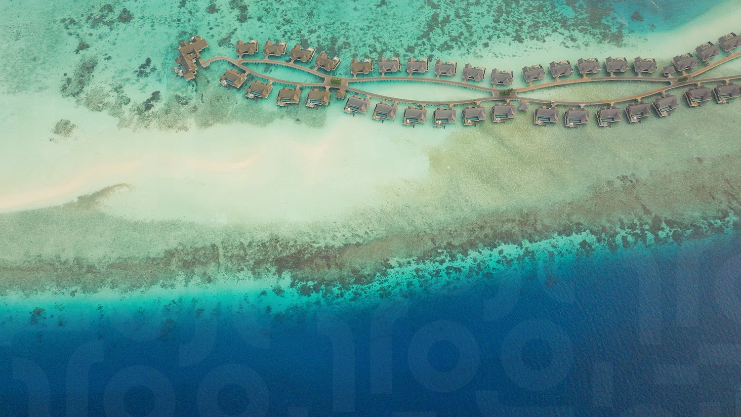 Stunning aerial view of luxurious overwater villas connected by wooden walkways, set amidst the vibrant turquoise and deep blue waters of a breathtaking tropical island resort.