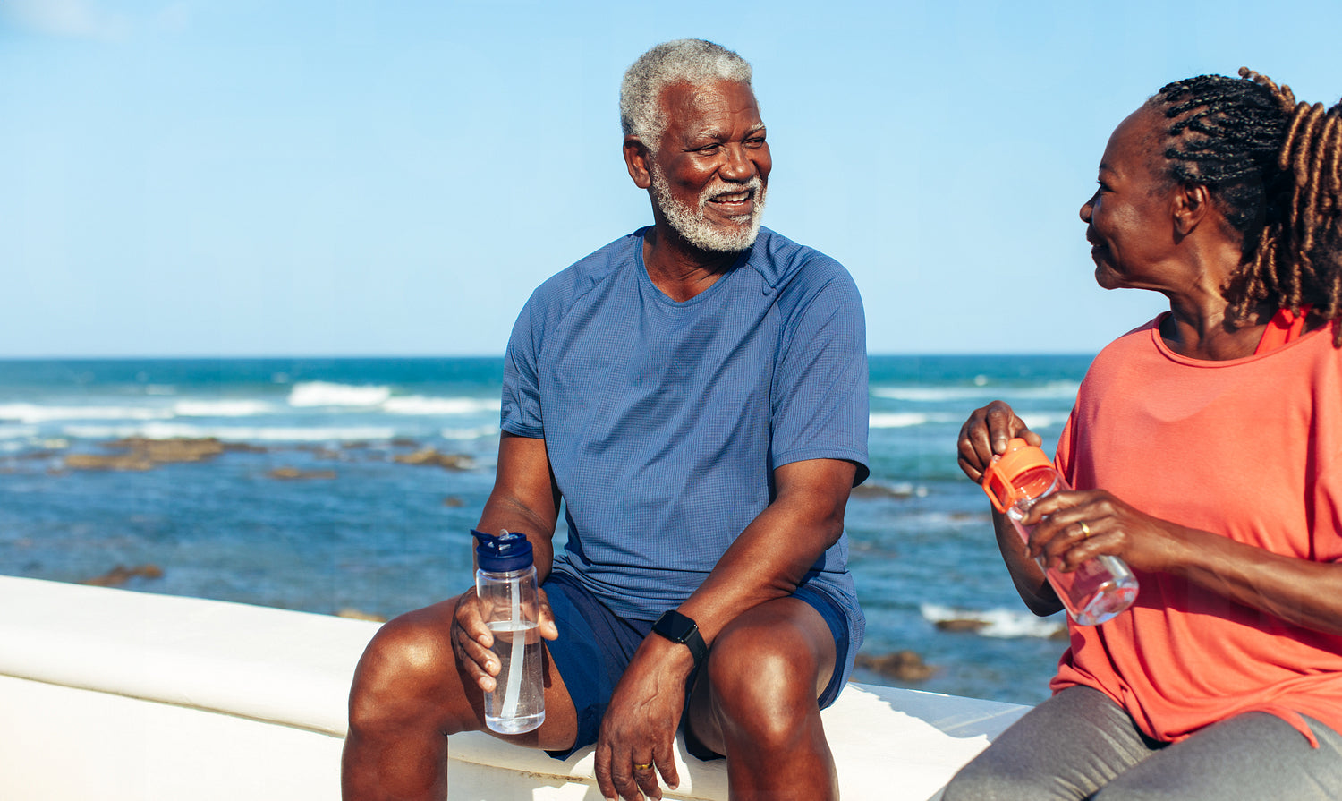 Smiling elderly couple taking a break by the seaside, holding water bottles and enjoying the moment. Perfect for concepts of mature relationships, health, and relaxation.