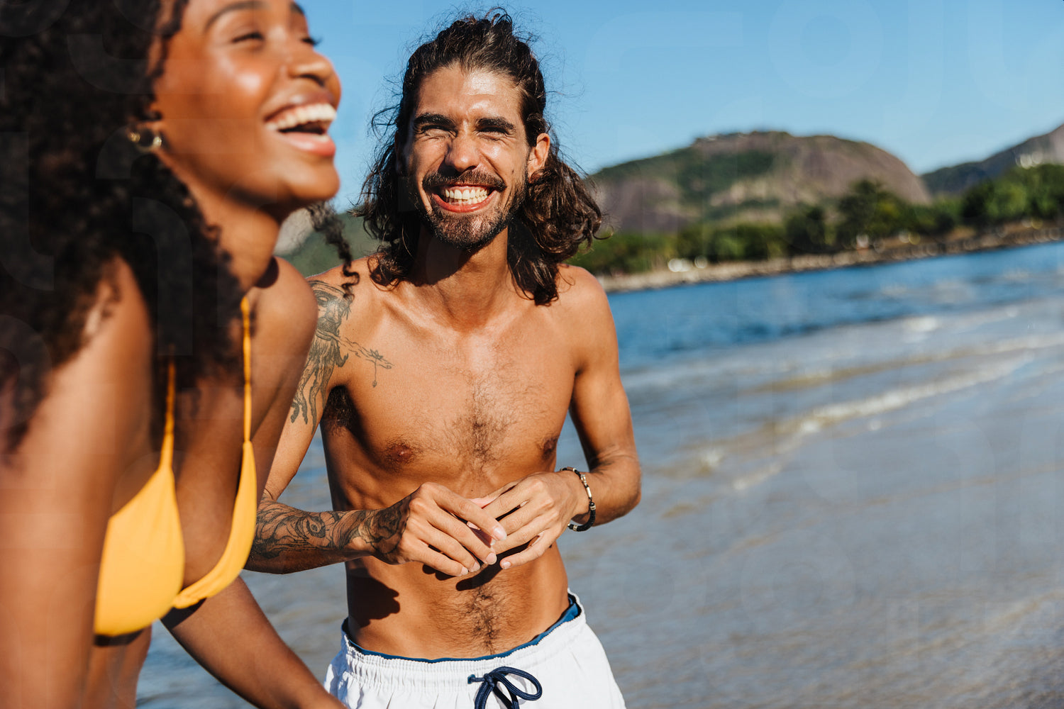 A happy couple shares a joyful moment on Praia do Flamengo beach. The sun shines brightly as they bask in the natural beauty of the ocean and surrounding landscape, capturing the essence of carefree summer fun.