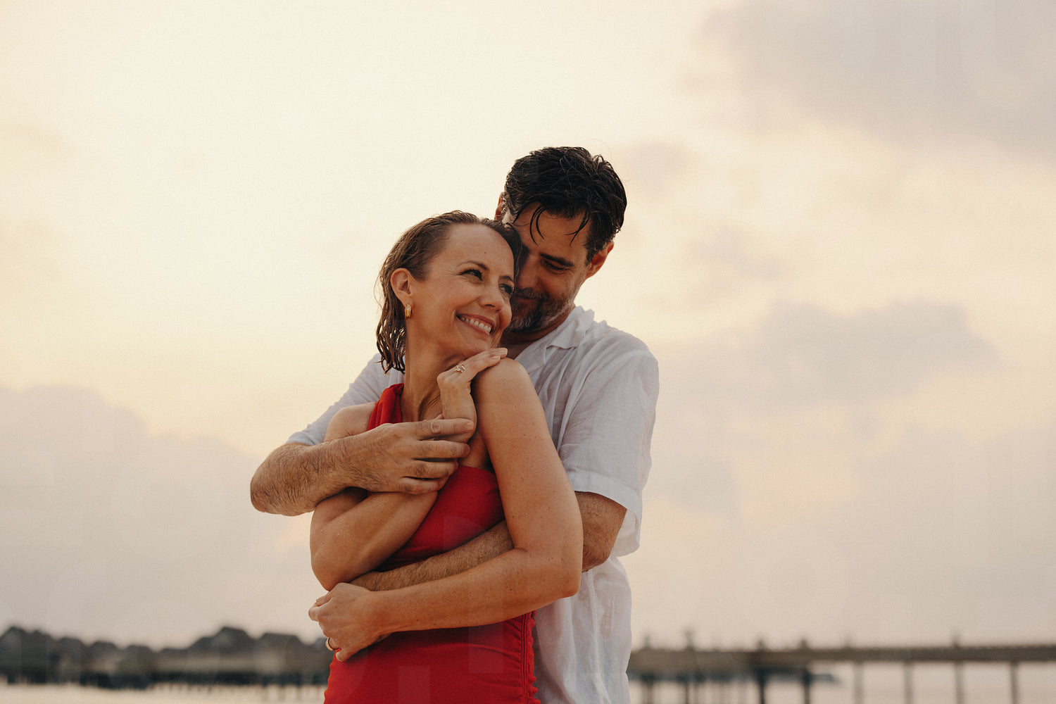 Mature couple embracing at sunset on a picturesque island