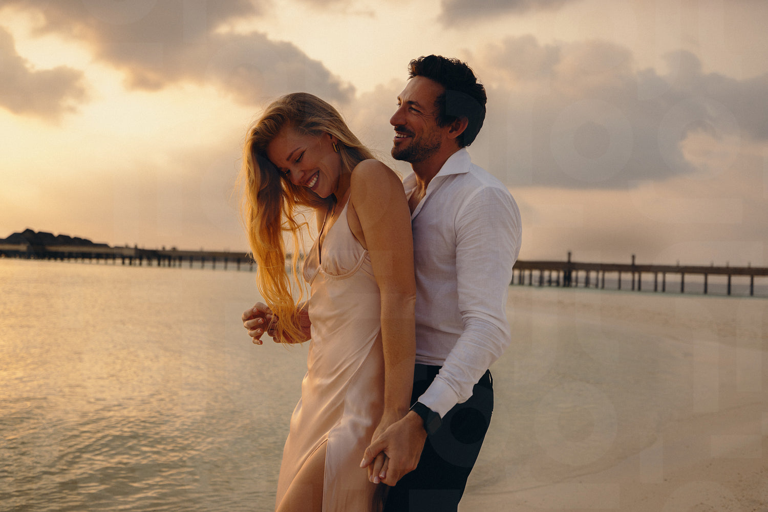 Playful couple having fun during their honeymoon at sunset on a beautiful tropical island beach, expressing joy and romance.