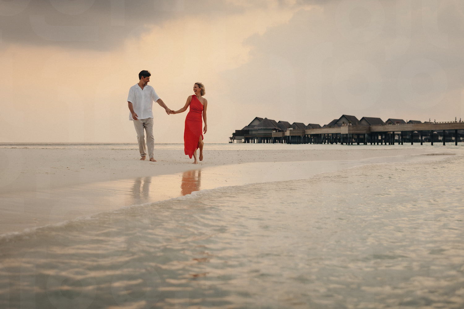 Retired couple enjoying a luxury vacation walking on a beach at sunset