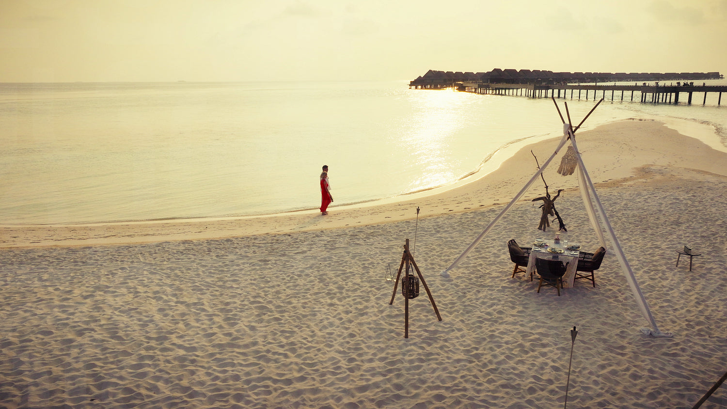 A romantic couple strolls along a pristine white sand beach at sunset. This luxury tropical resort offers an intimate setting for a perfect vacation, creating unforgettable moments together.