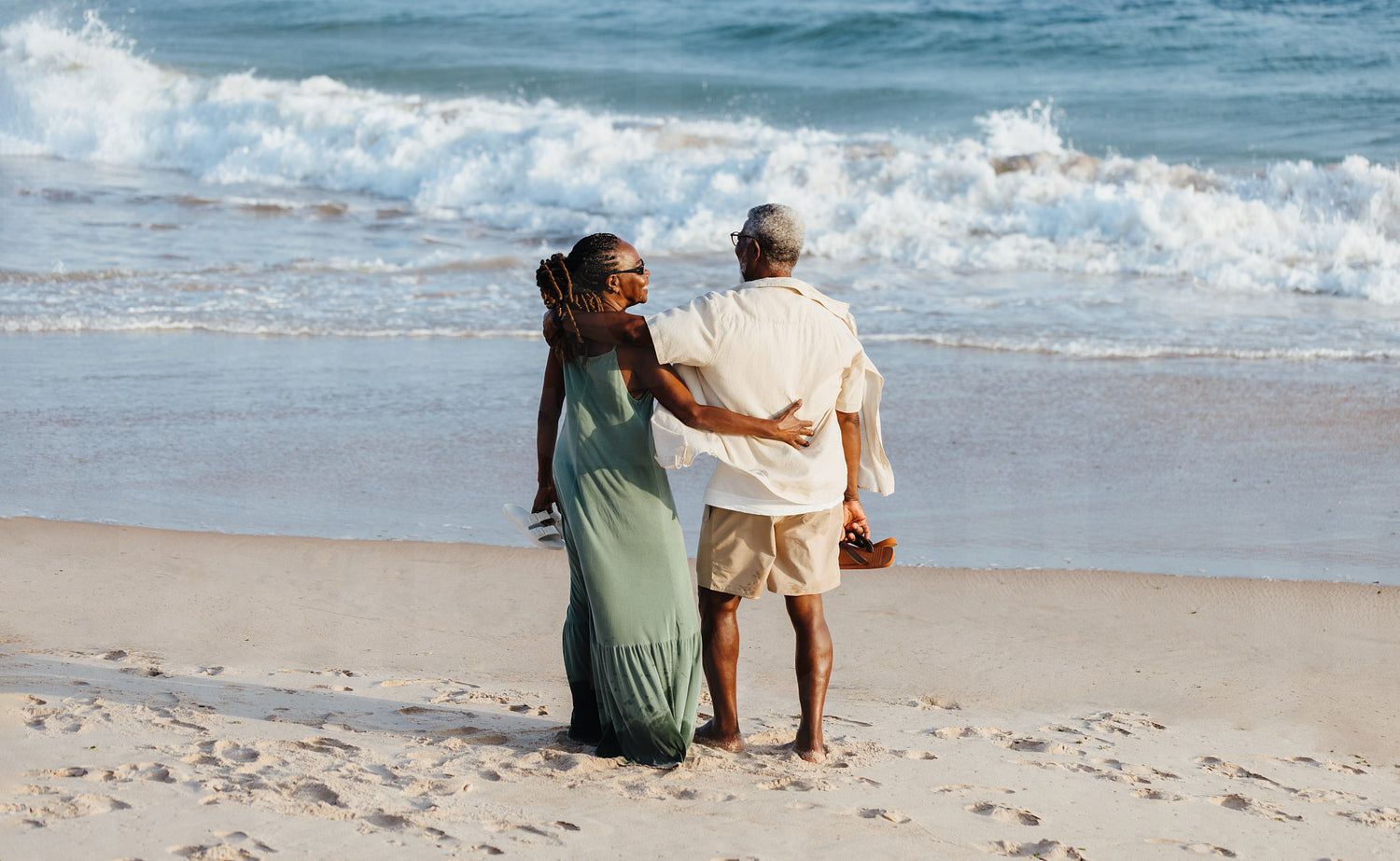 A senior African American couple in a loving embrace walks along a sandy beach, with waves crashing gently in the background, symbolizing enduring love and companionship.