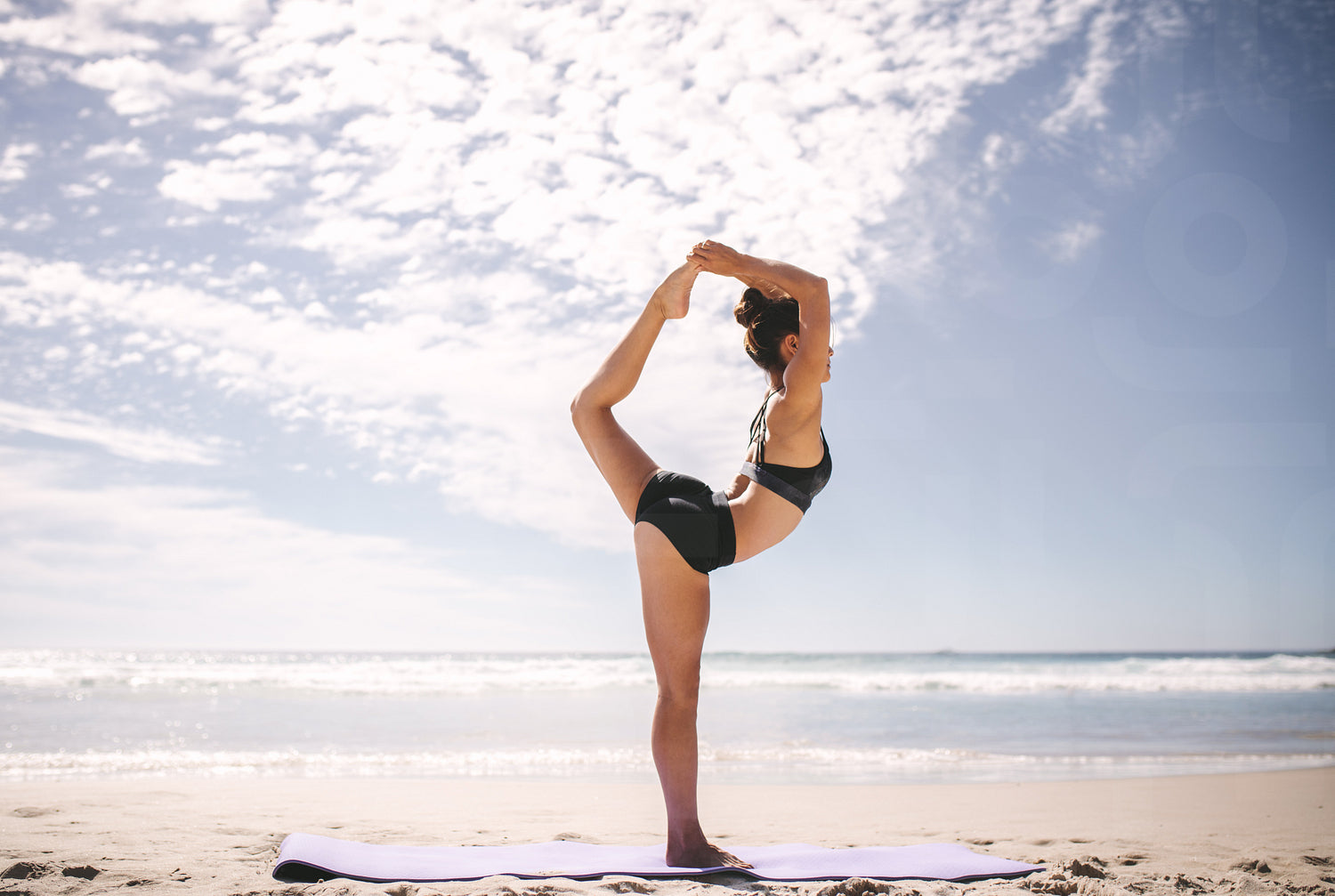 Side view of young woman standing on one leg holding foot at beach. Female in sportswear doing Natarajasana yoga pose.