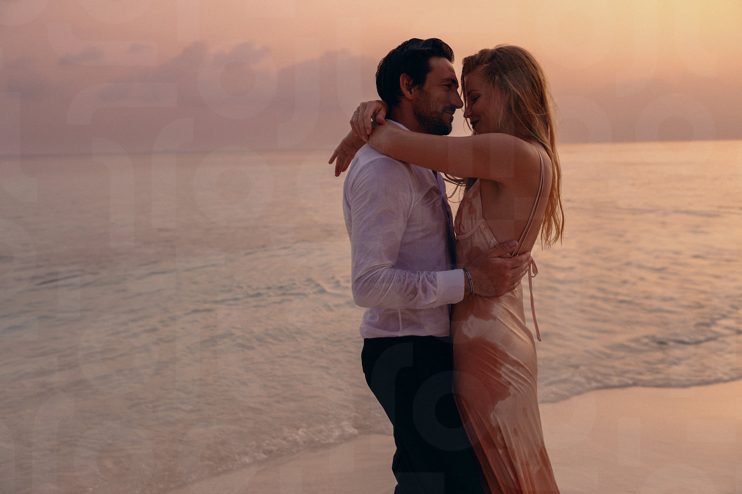 Young couple enjoying a romantic moment on their honeymoon, embracing on a beach at sunset with gentle waves in the background.