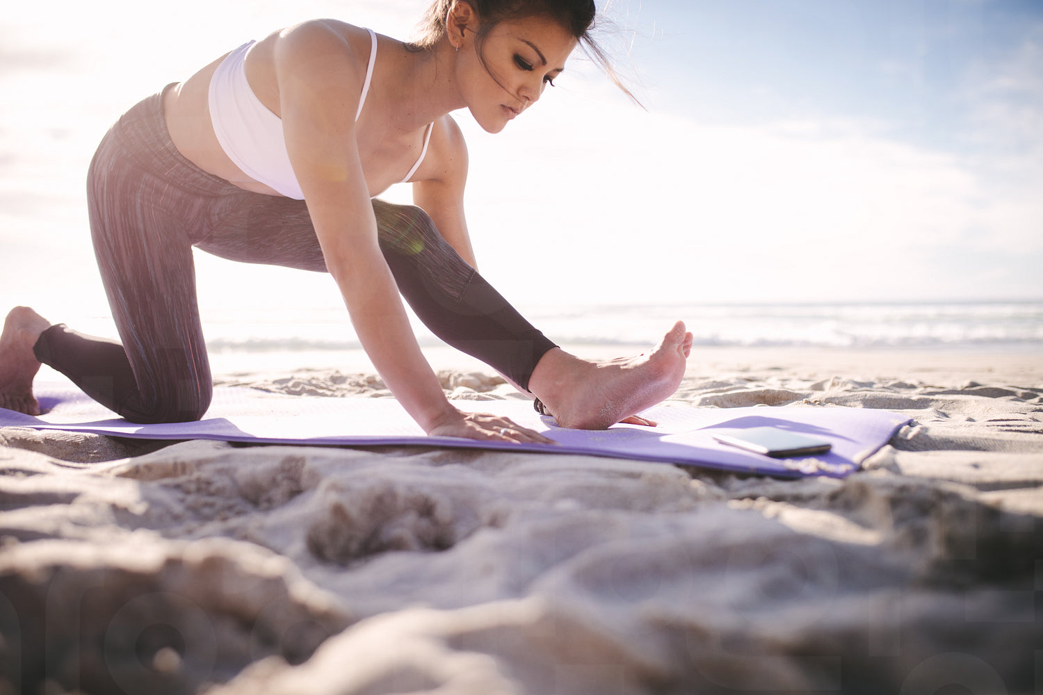 Woman doing leg stretches on the beach. Young fitness woman stretching on a beach.