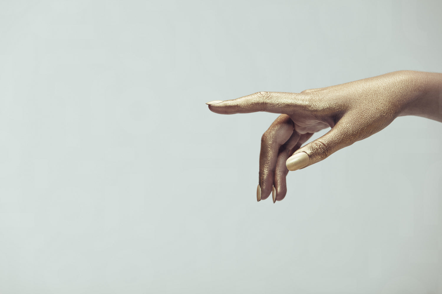 Golden painted hand pointing over grey background. Female hand in golden paint pointing finger.