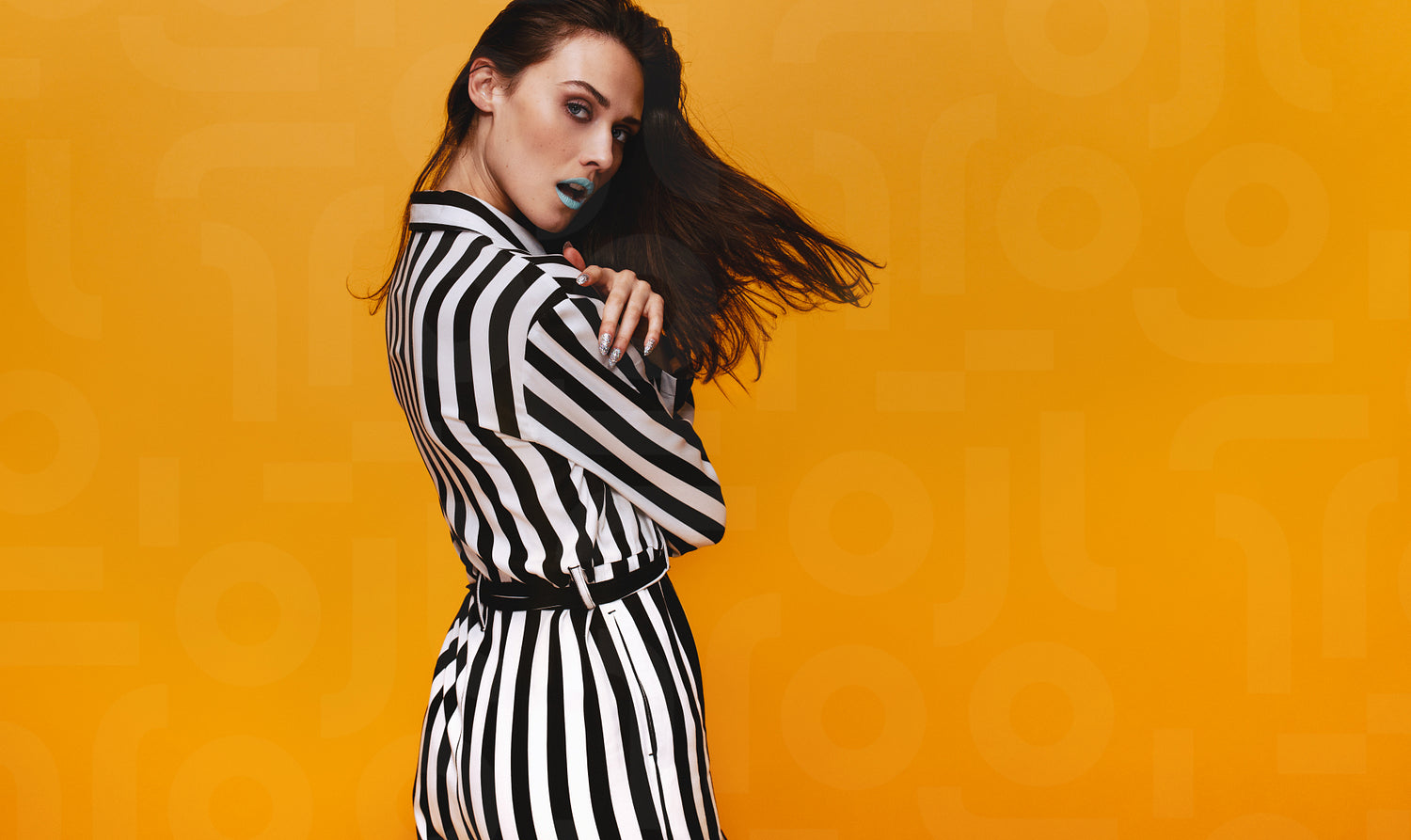 Portrait of stunning young woman wearing striped dress standing against orange background. Beautiful female model with vivid makeup posing in studio.