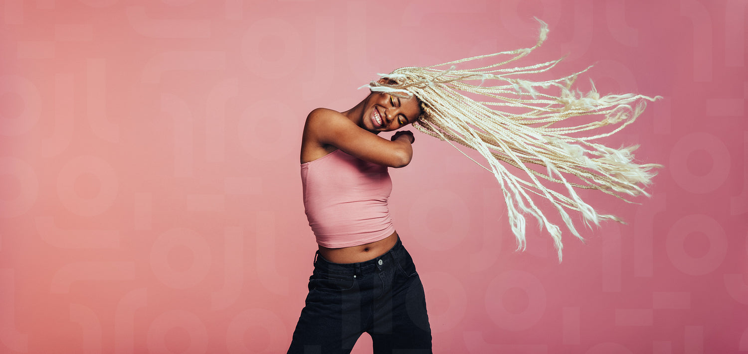 Portrait of happy woman dancing on pink background. Woman flying her long braided hair while dancing.