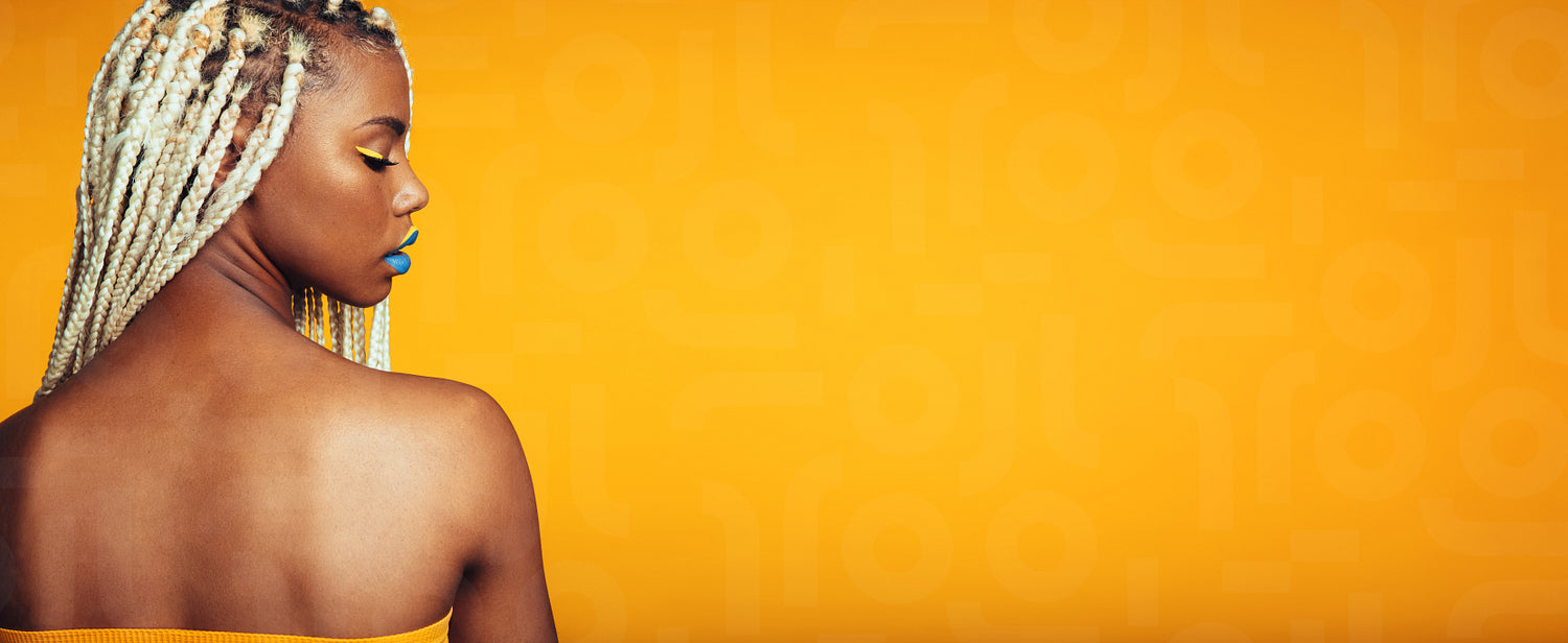 Close up of fashionable woman with painted lips. Rear view portrait of african american woman on yellow background.