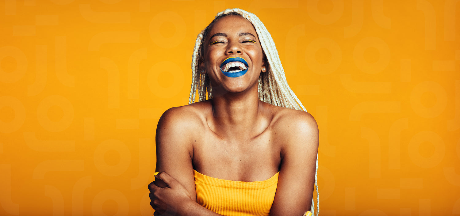 African american female laughing with closed eyes. Happy woman with painted lips and braided hair on yellow background.