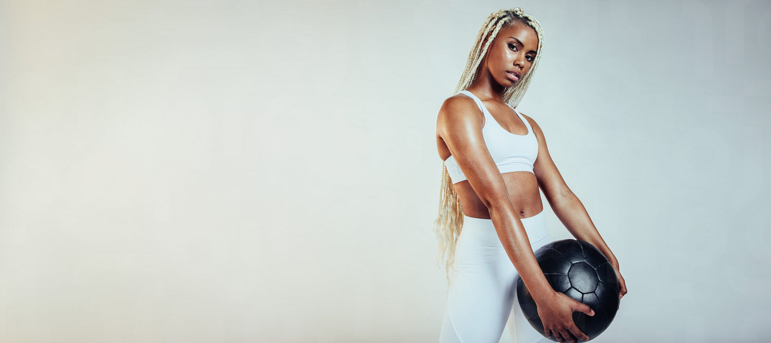 African american fitness woman working out using medicine ball. Fit woman doing workout using medicine ball on white background.