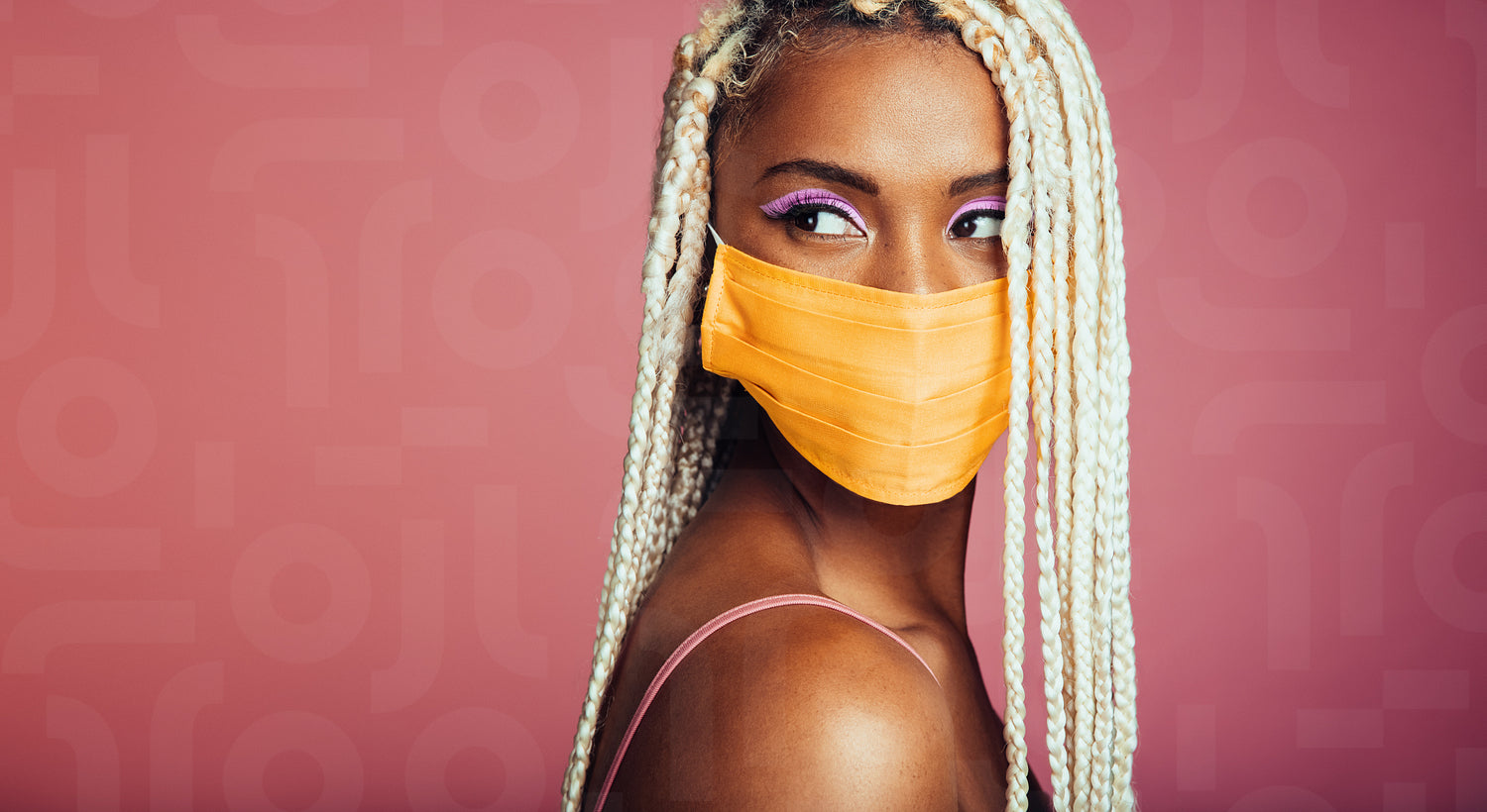Young african woman with blonde box braids wearing protective face mask. Female with african hair style and face mask looking away on pink background.