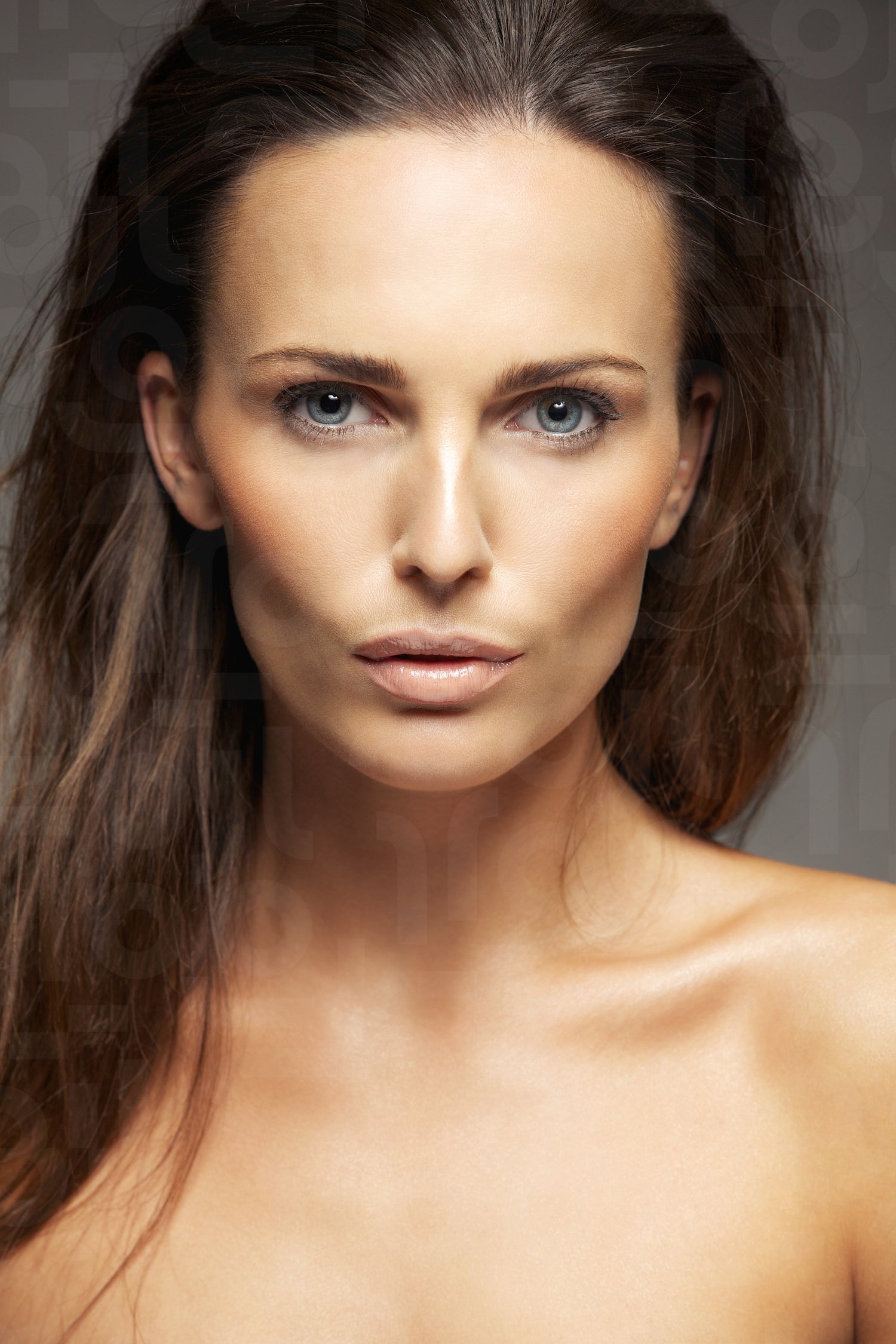 Closeup of a young lady with skin looking at camera smiling isolated on gray background. Natural Beauty with fresh and clean skin
