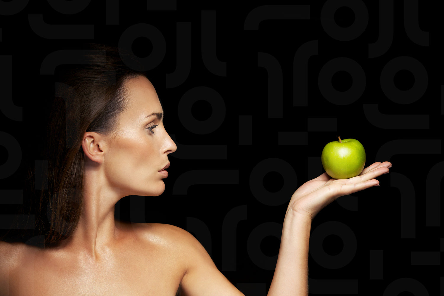 Profile view of beautiful woman holding green apple in her palm. Healthy caucasian woman with apple on black background.