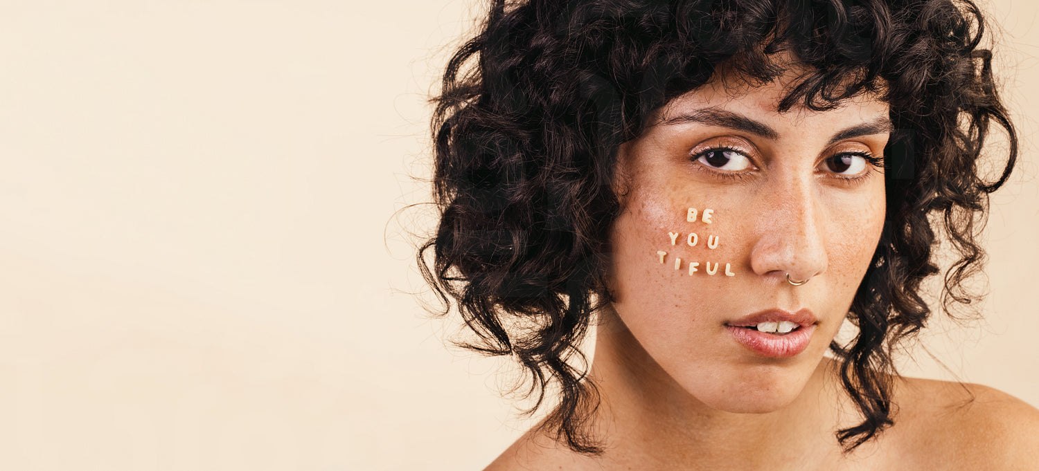 Attractive young woman looking at the camera with the word "BEAUTIFUL" written on her face. Body positive young woman feeling confident in herself and embracing her natural beauty.