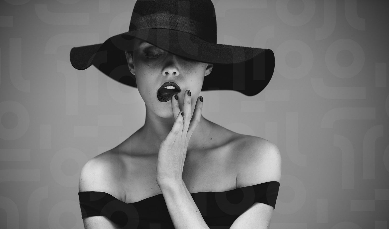 Fashion portrait of a sensual woman with hat touching her lips. Flirty elegant female in black and white.