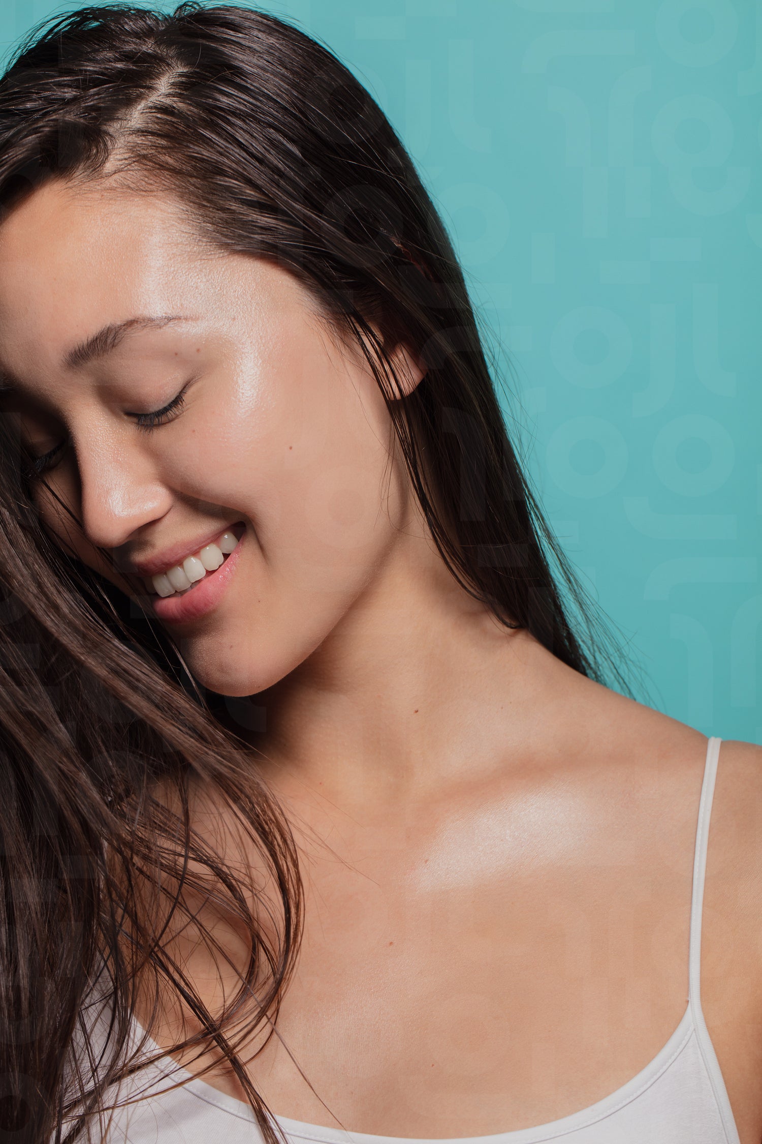 Charming young asian woman against blue background. Natural looking asian girl.