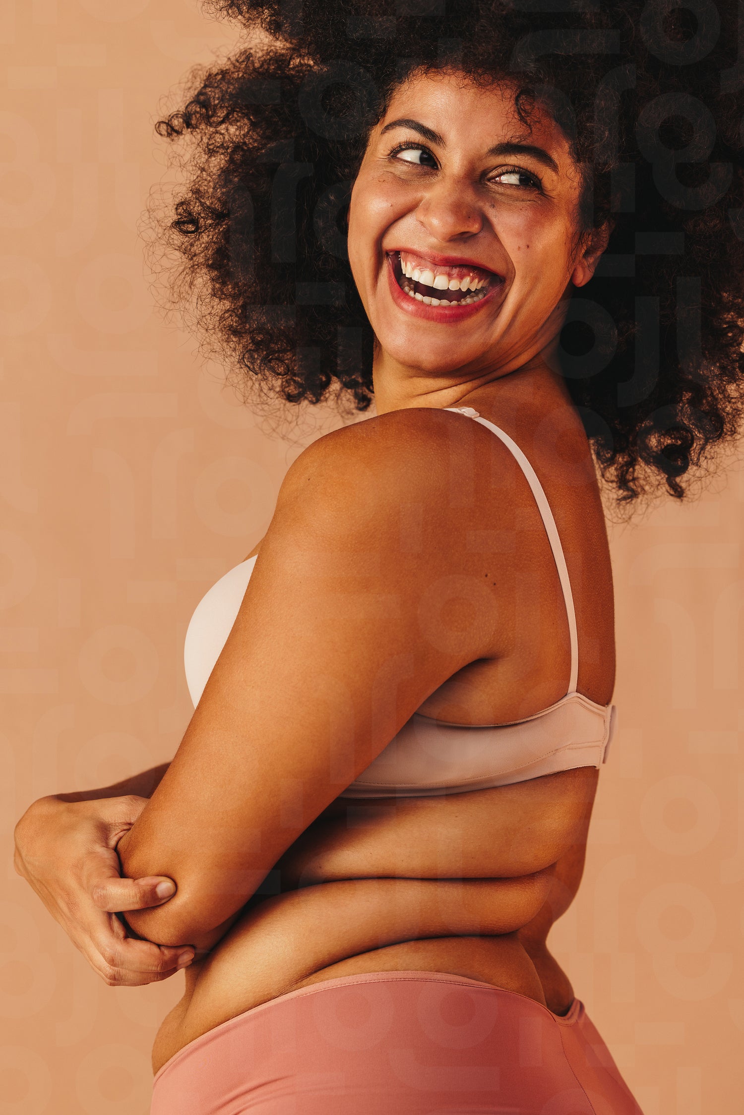 Confident plus size woman looking away with a cheerful smile while wearing underwear. Body positive woman with an Afro hairstyle embracing her natural body and curly hair.