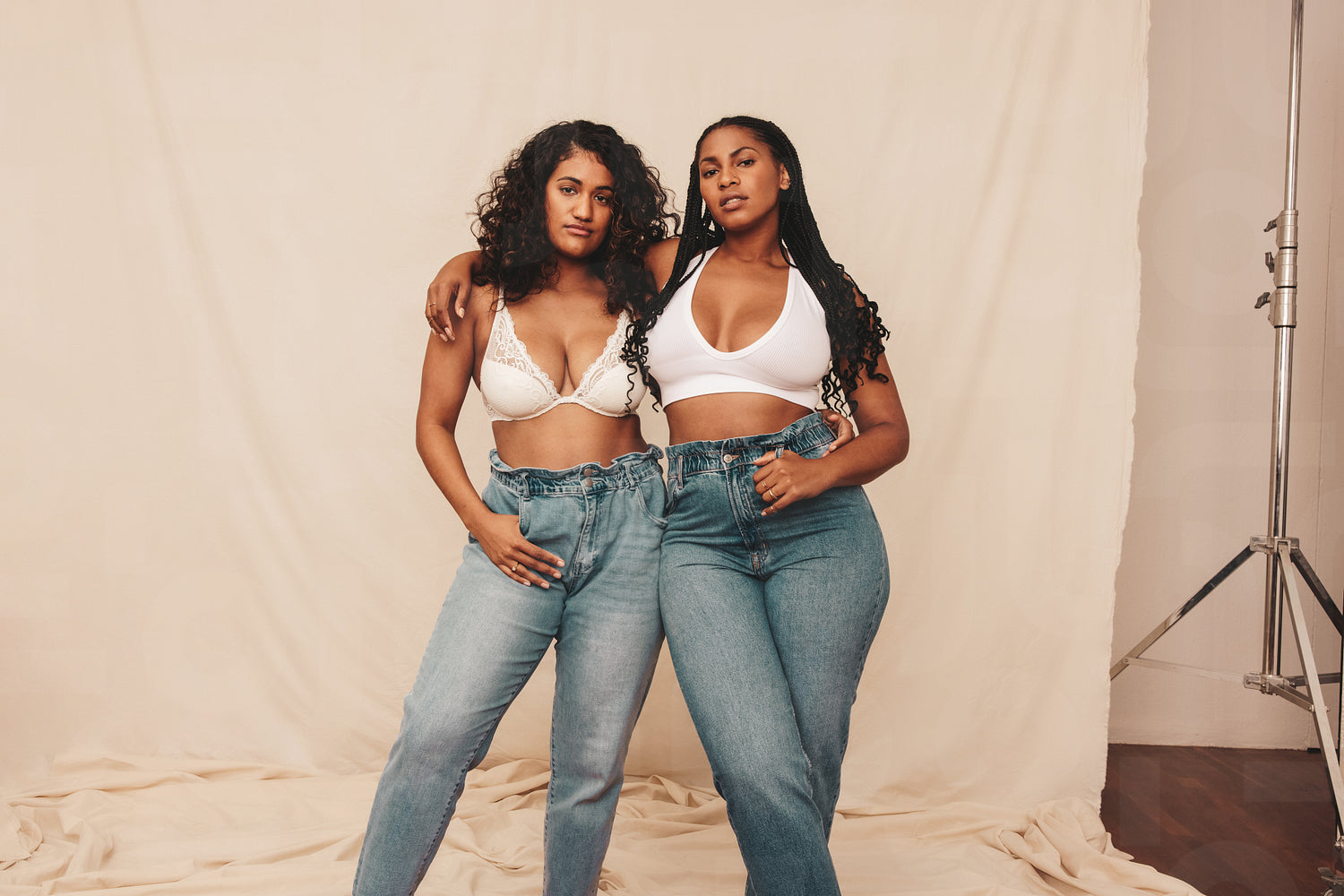 Rocking denim jeans. Two confident young women looking at the camera while standing together against a studio background. Two female friends embracing their natural bodies.