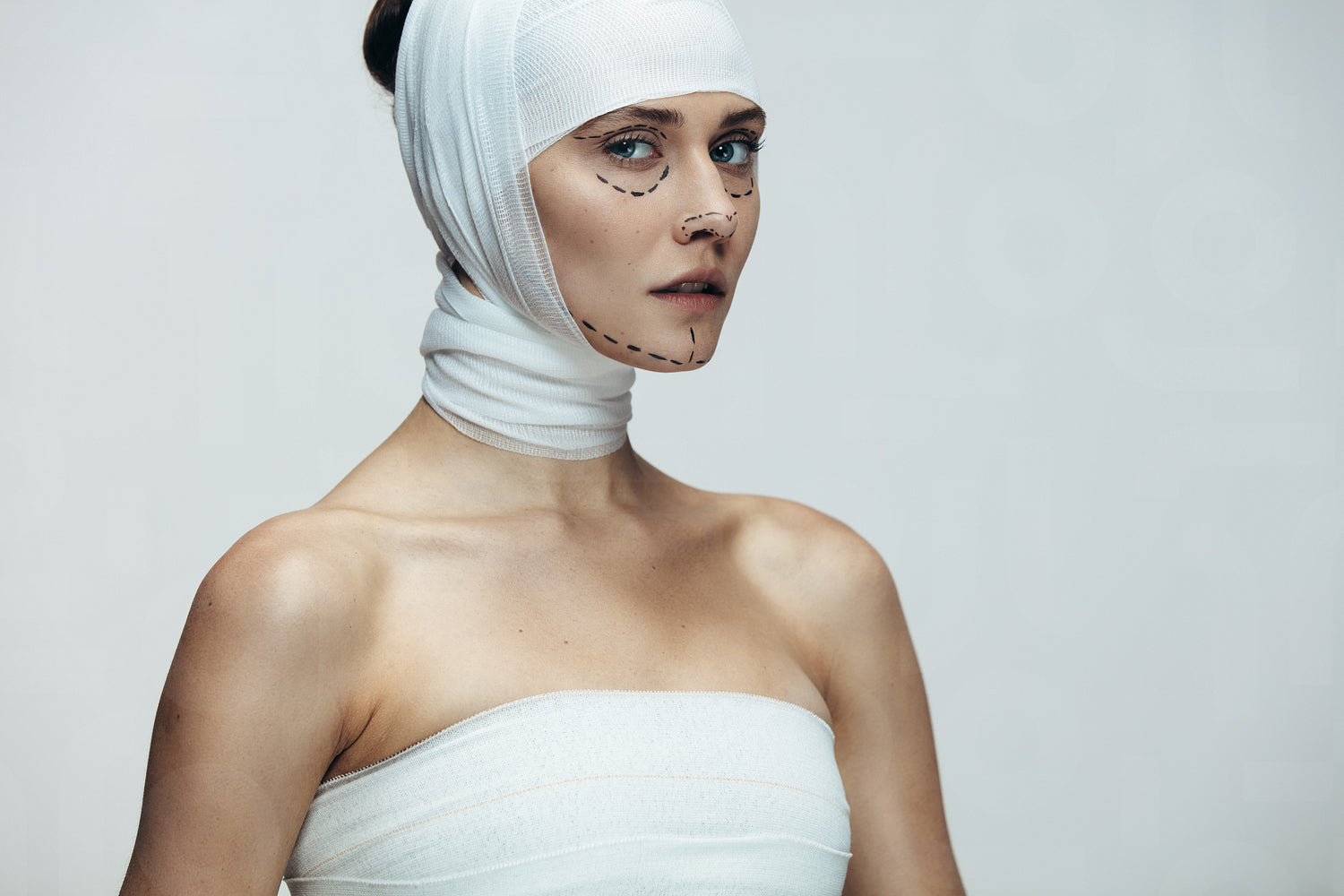 Portrait of woman with dotted line on face and bandage around her head before surgery. Female before cosmetic surgery on her face against grey background.