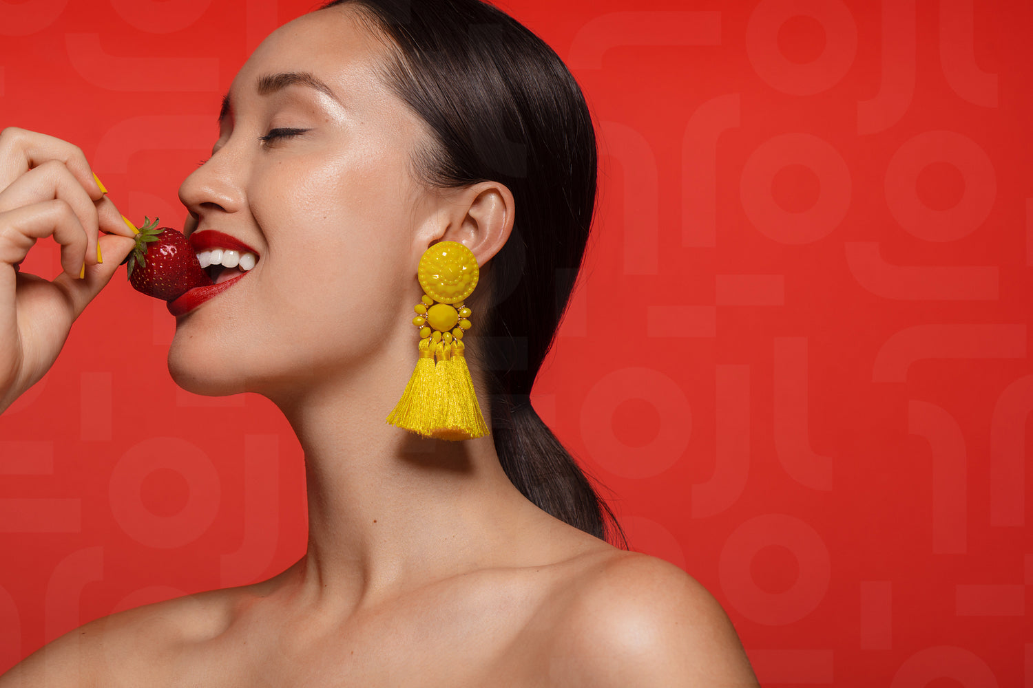 Portrait of beautiful young woman eating fresh strawberry with her eyes closed. Female model with long earring having strawberry on red background.