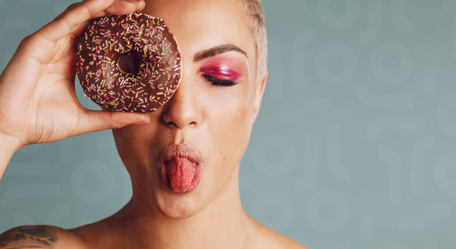 Close-up of a woman with short hair holding a donut and sticking out tongue. Female model a donut in front of her face on grey background.