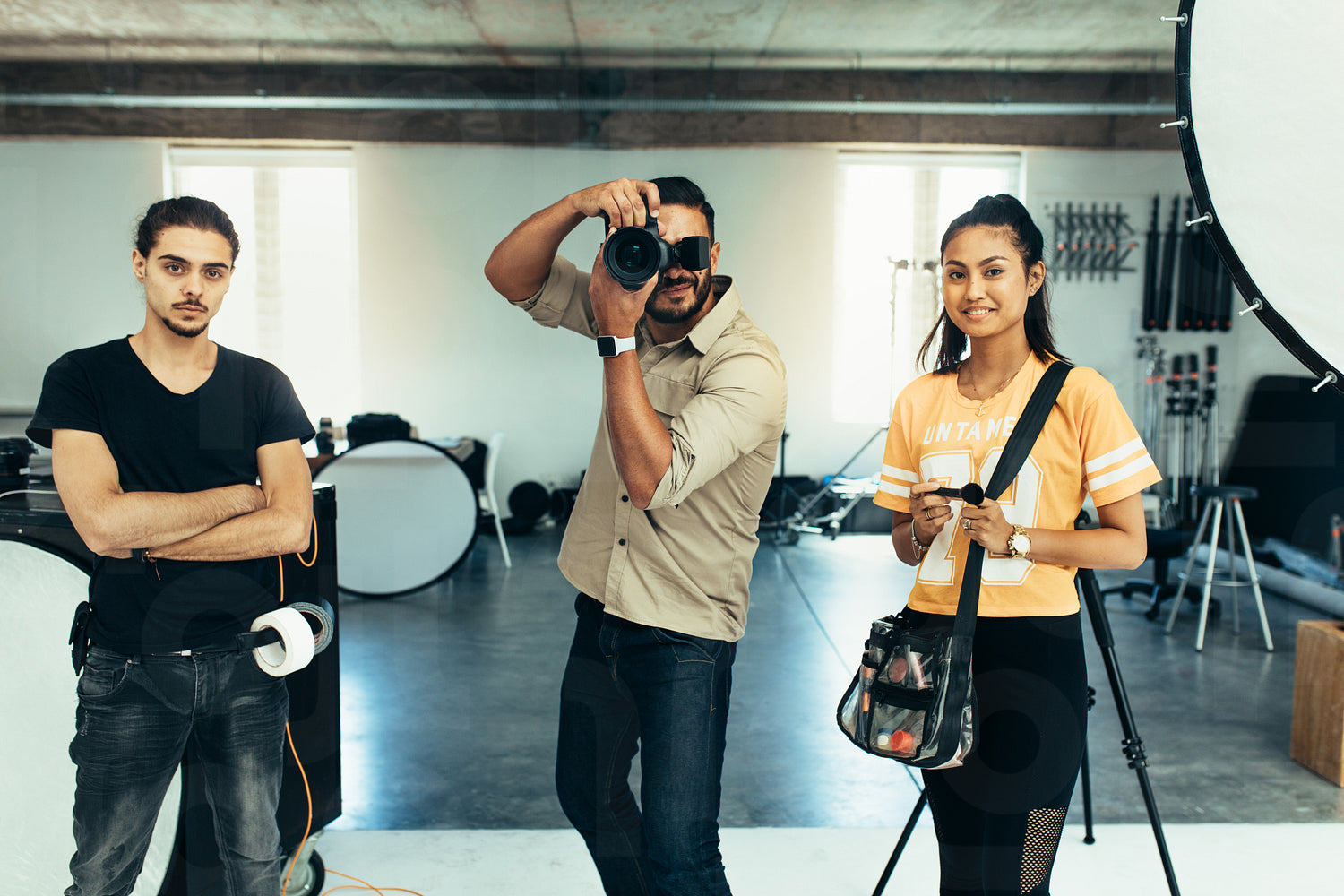 Photographer taking photos in a studio with his crew standing beside him. Photographer with his team during a photo shoot in a studio.
