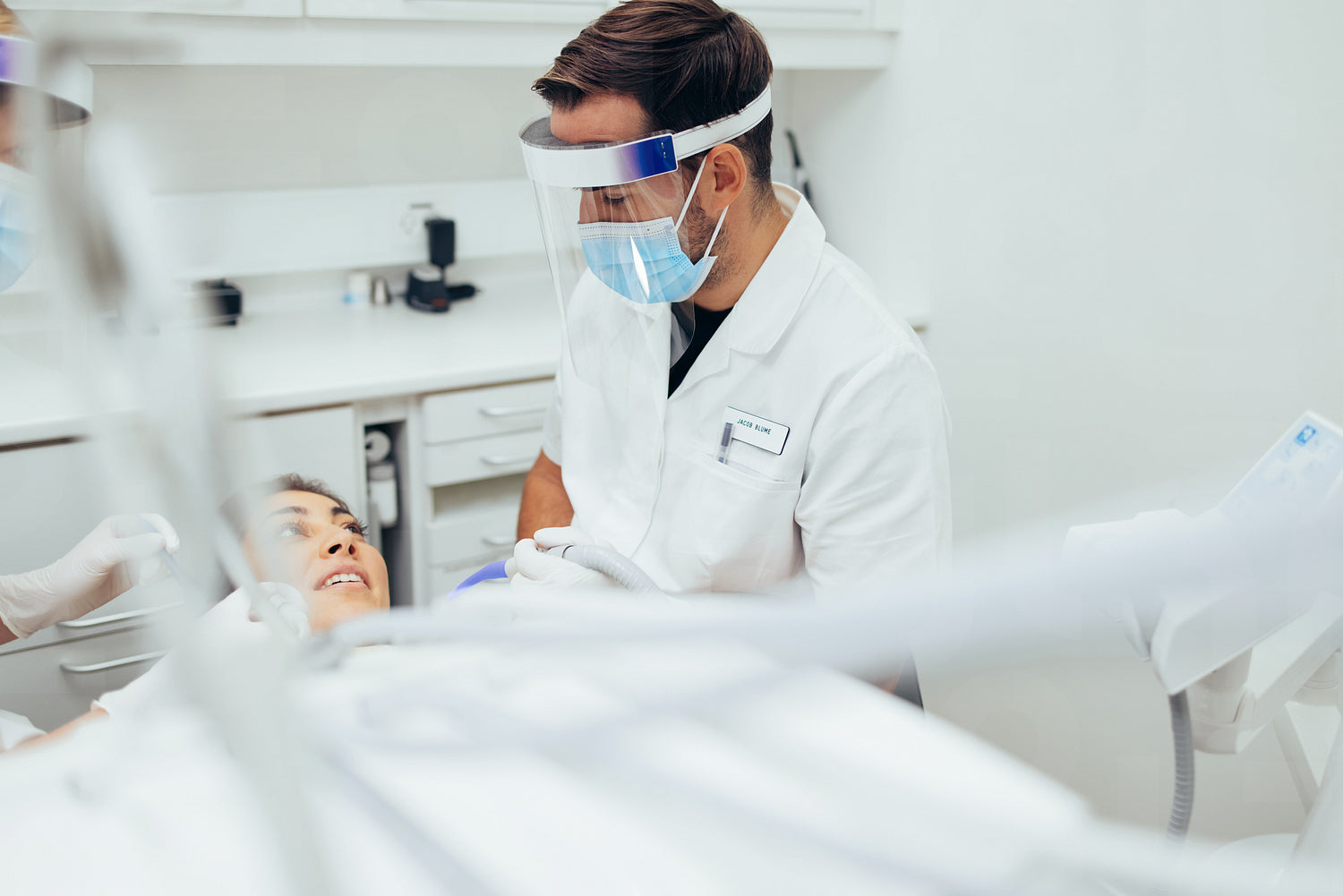 Dentist treating a female patient at dental clinic. Male doctor wearing mask and face shield discussing treatment with patient at dental clinic.