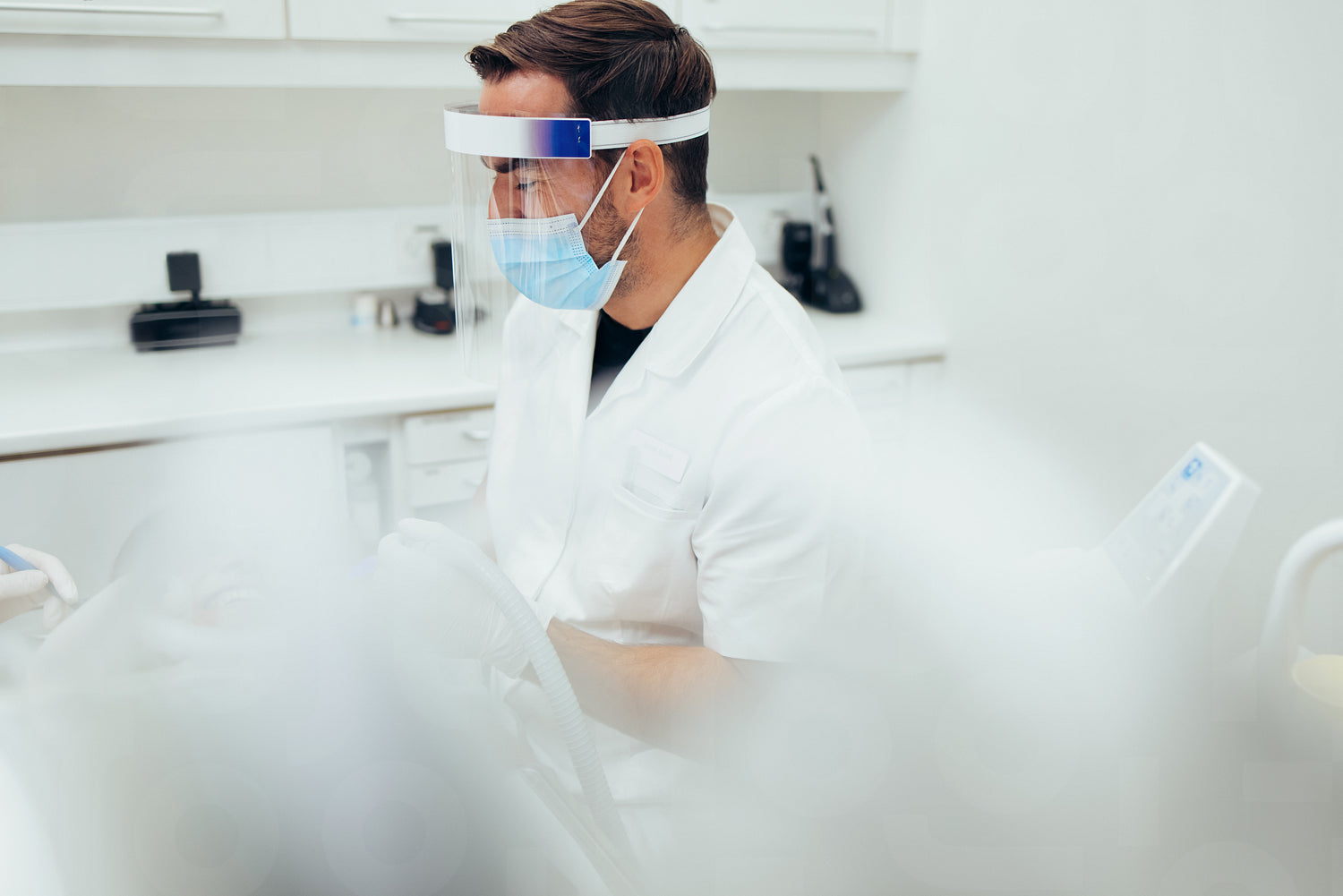 Male doctor wearing a mask and face shield while doing treatment on a patient at dental clinic. Dentist treating teeth of patient in his clinic.