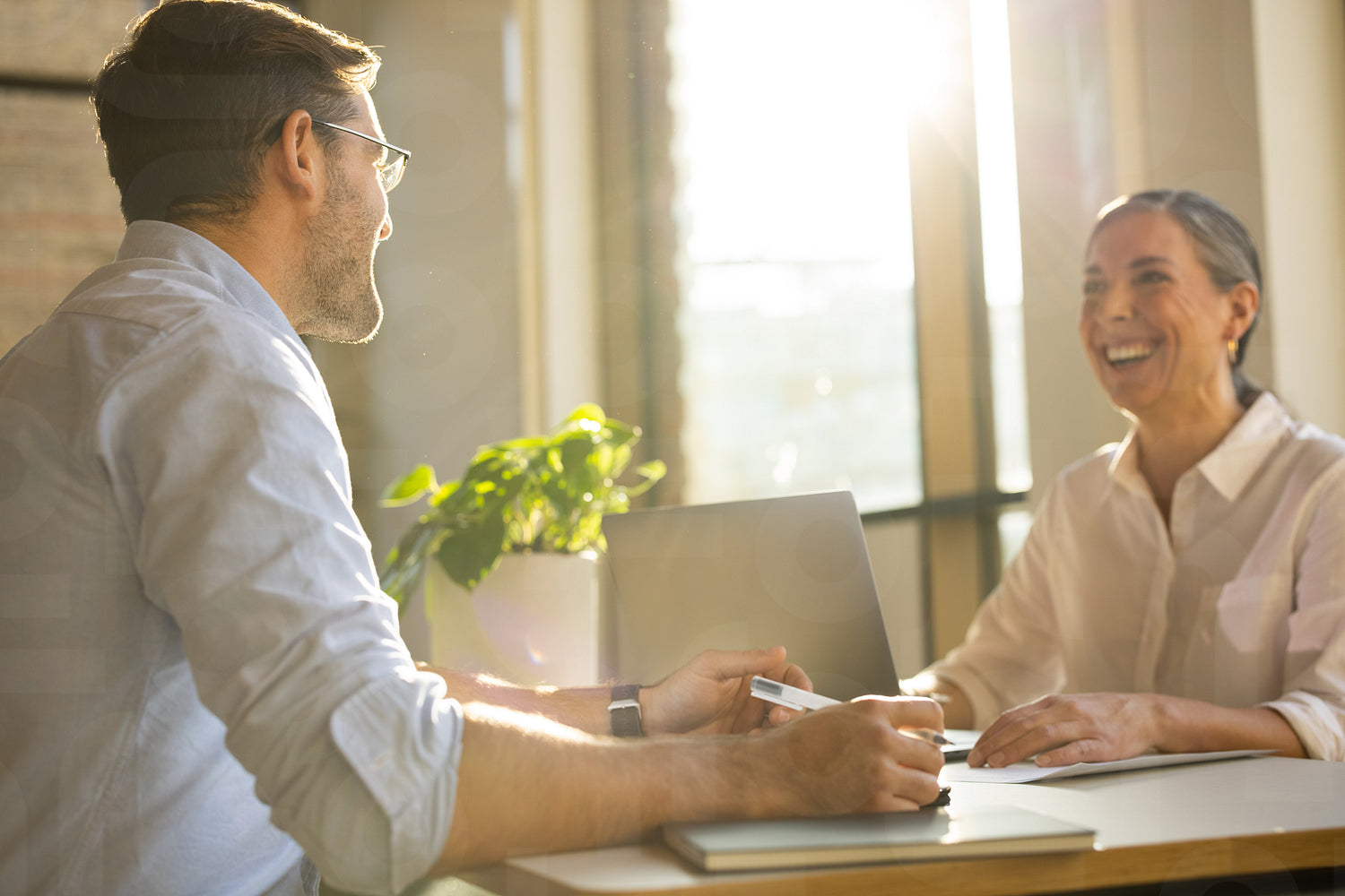 Smiling people during business interview in office. Man and woman sitting across table during screening interview.