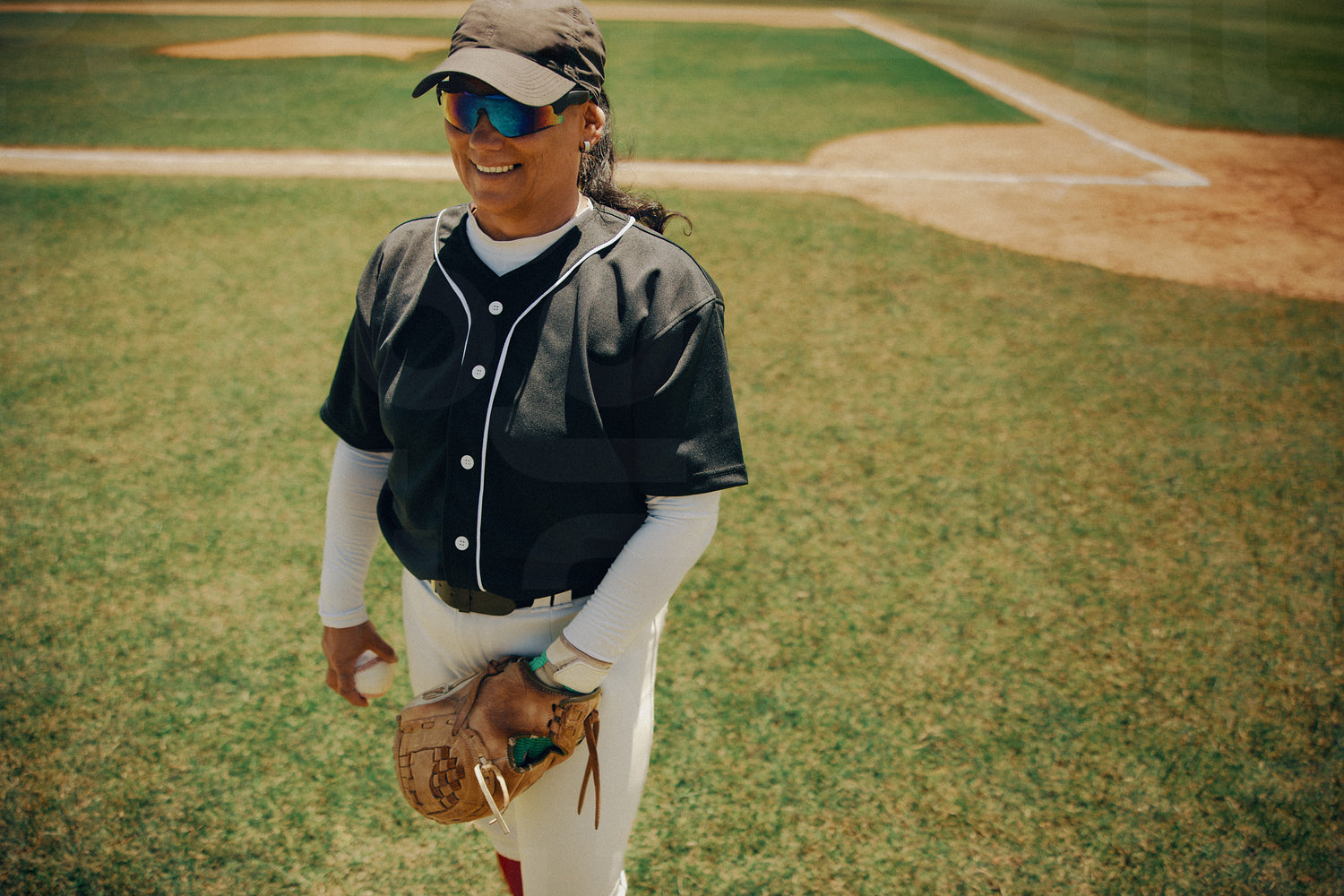 Smiling baseball pitcher wearing sunglasses on a sunny day at the field
