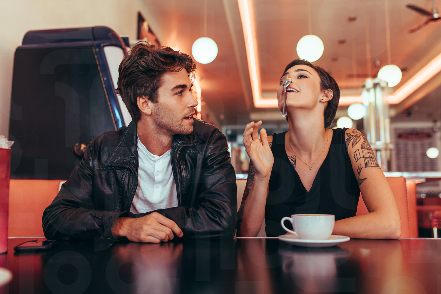 Woman sticking a spoon to her nose sitting at a diner with her boy friend. Couple sitting at a restaurant with a coffee on the table and having fun.