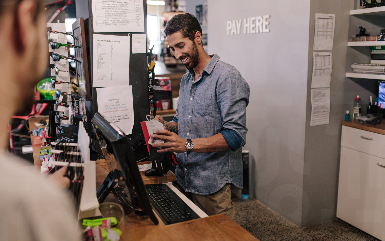Smiling sports shop owner preparing bill at the payment counter.