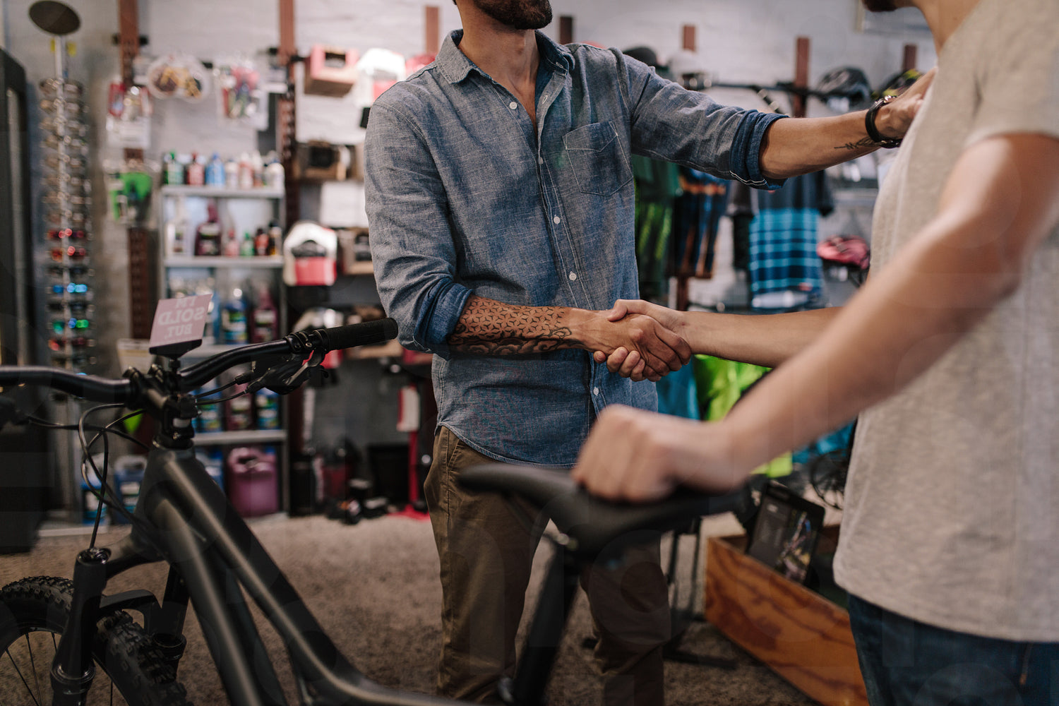 Cropped shot of shop owner giving a handshake to a customer after selling a bicycle.