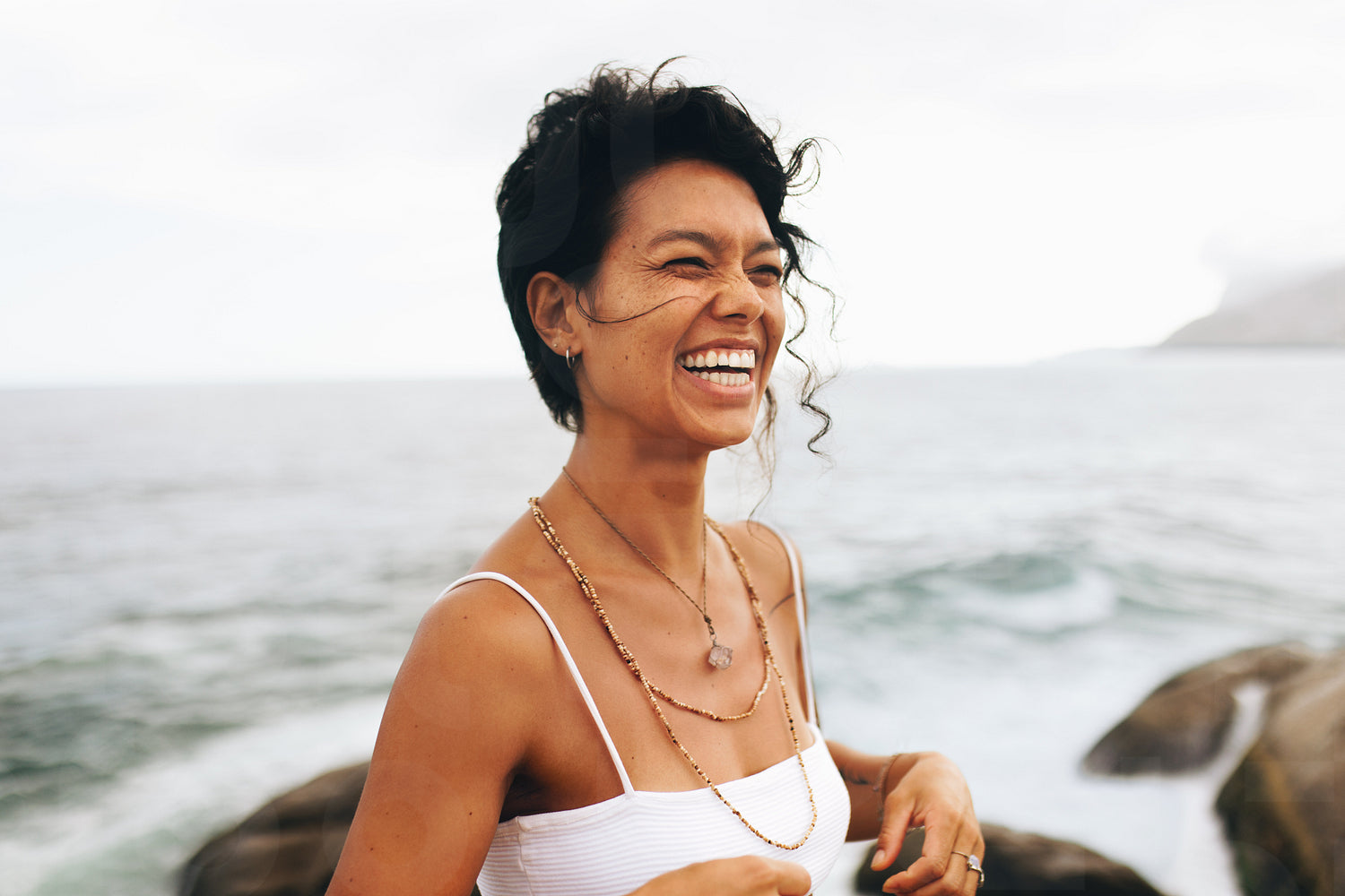 Carefree woman laughing by the ocean, experiencing joy and peace with bohemian jewelry and wavy hair.