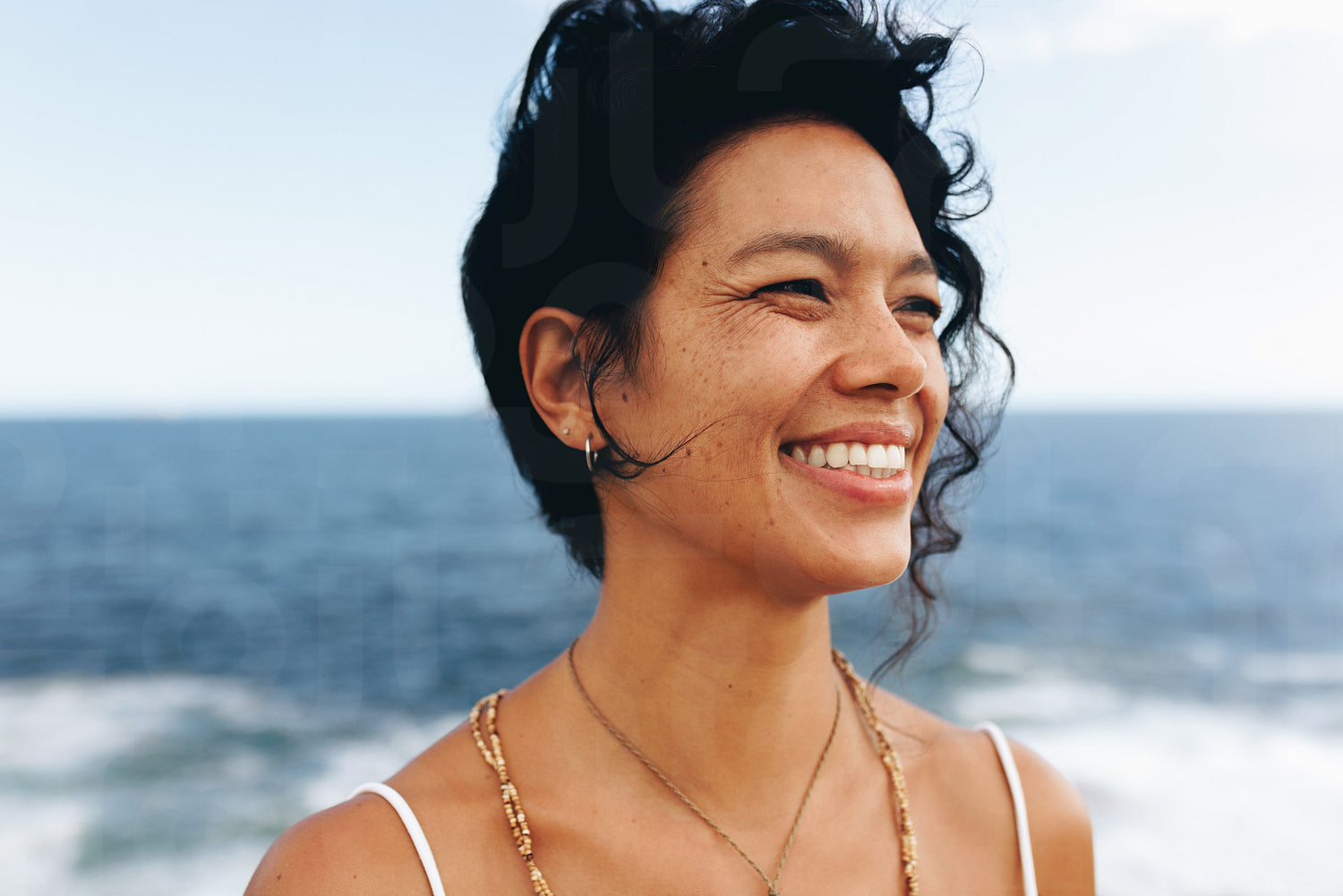 Close-up of smiling woman with wavy hair and bohemian jewelry at the seaside