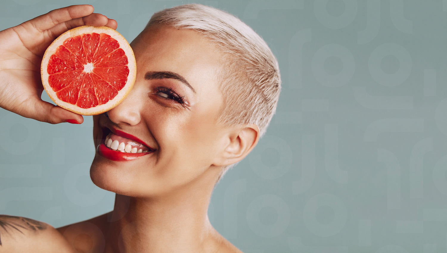 Close-up of a woman holding a grapefruit infront of her eye against grey background. Beautiful female model with short blond hair holding a grapefruit slice and smiling.