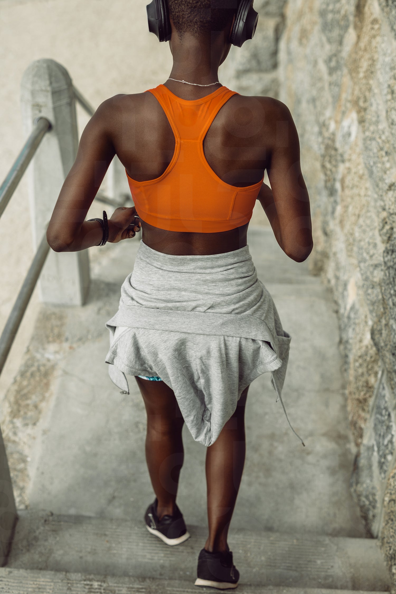 Rear view of a fitness woman running down the steps outdoors. Young female runner working out on steps .