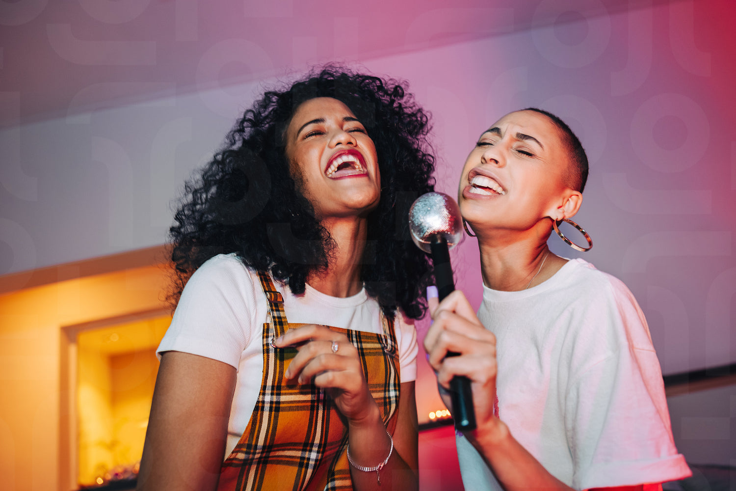 Best friends singing into a microphone on karaoke night. Two cheerful young women singing their favourite song at a house party. Happy female friends having a good time during the weekend.