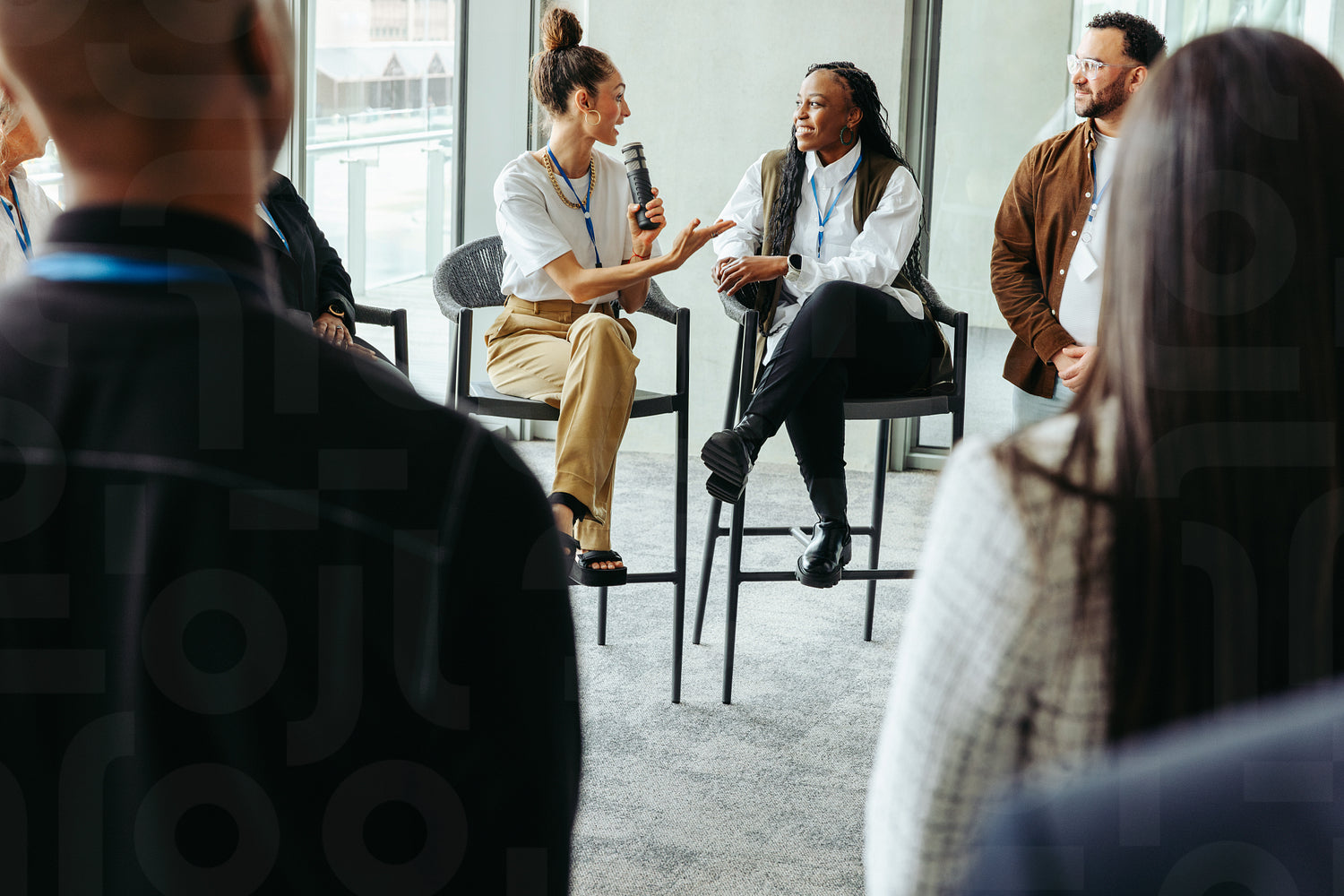 Group of professionals engaging in a business panel discussion and debate, sharing insights and ideas in a modern conference setting.