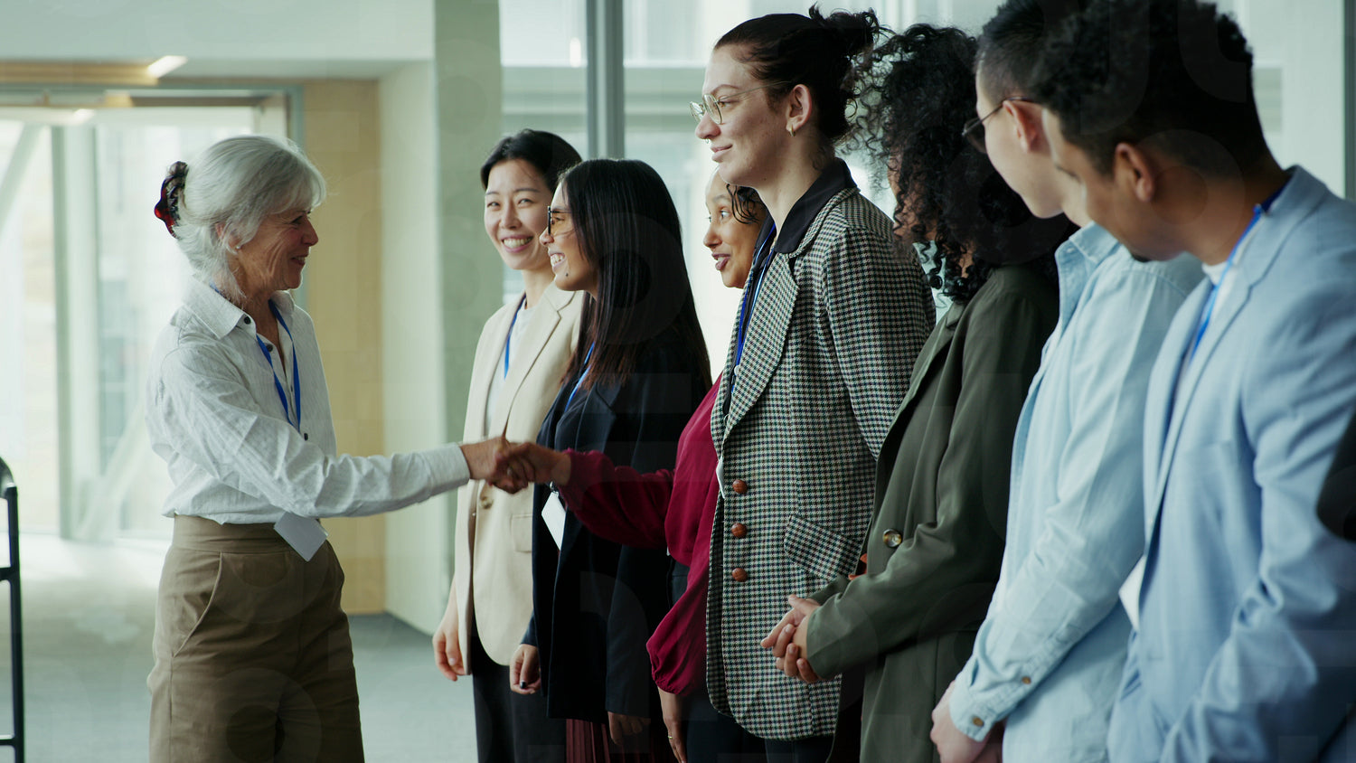 A senior business professional shakes hands and greets a line of smiling, enthusiastic new colleagues at a professional conference or corporate event, fostering connections and building team rapport.