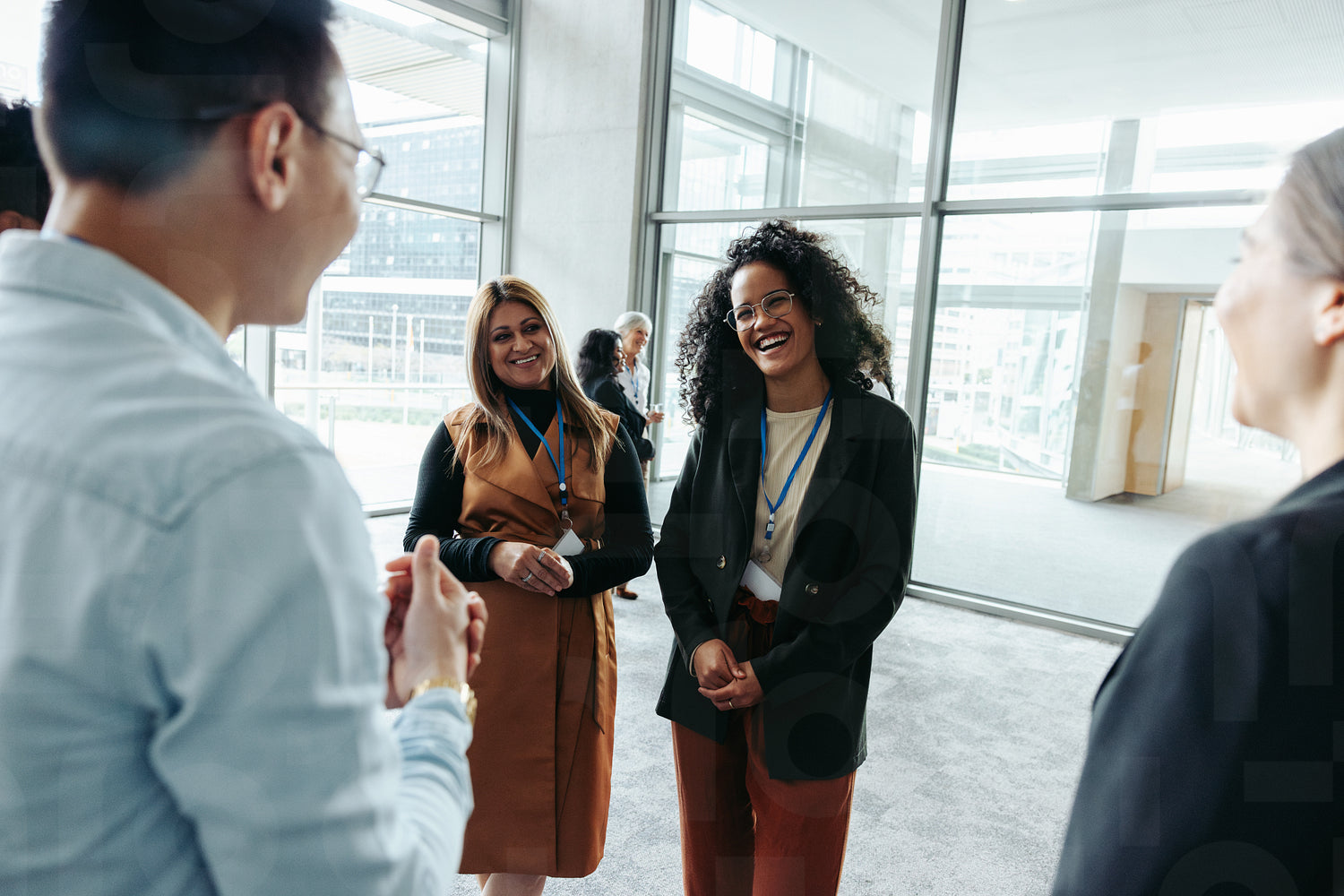 Group of colleagues engaging in networking at a corporate event, sharing laughter and socializing in a modern office environment.
