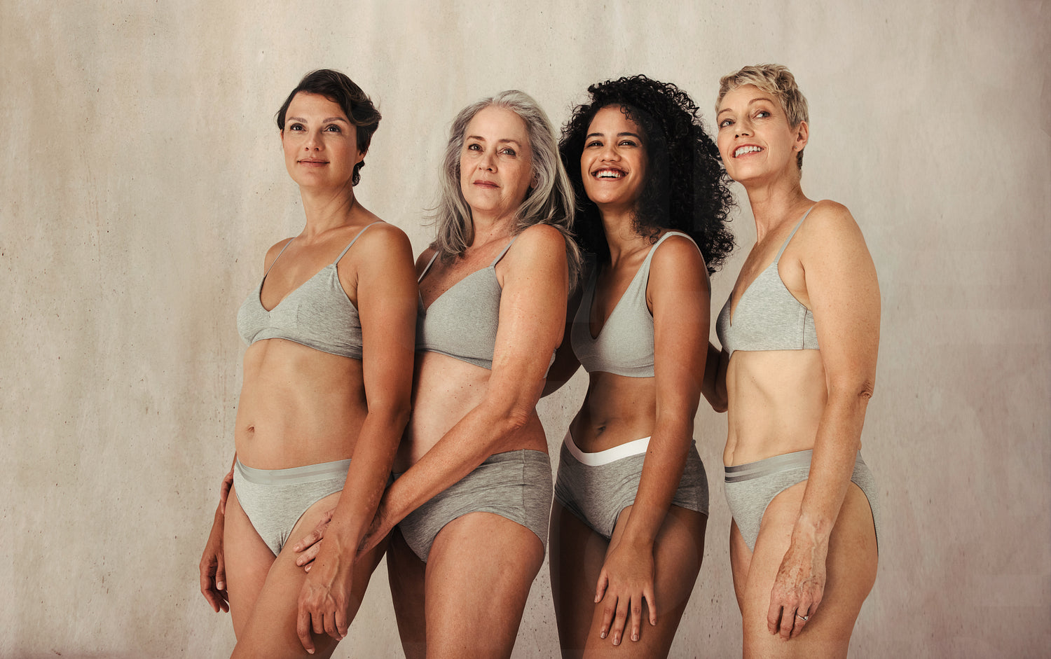Group of diverse and confident women posing in their natural bodies. Four body positive women of different ages wearing underwear and standing together against a studio background.