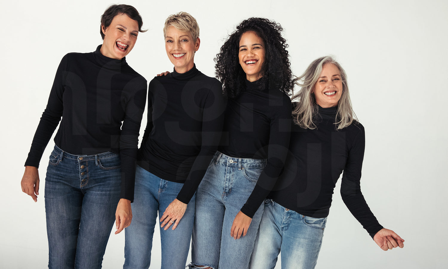 Stunning group of diverse women celebrating their age in a studio. Four body positive women of different ages smiling cheerfully while wearing jeans against a white background.