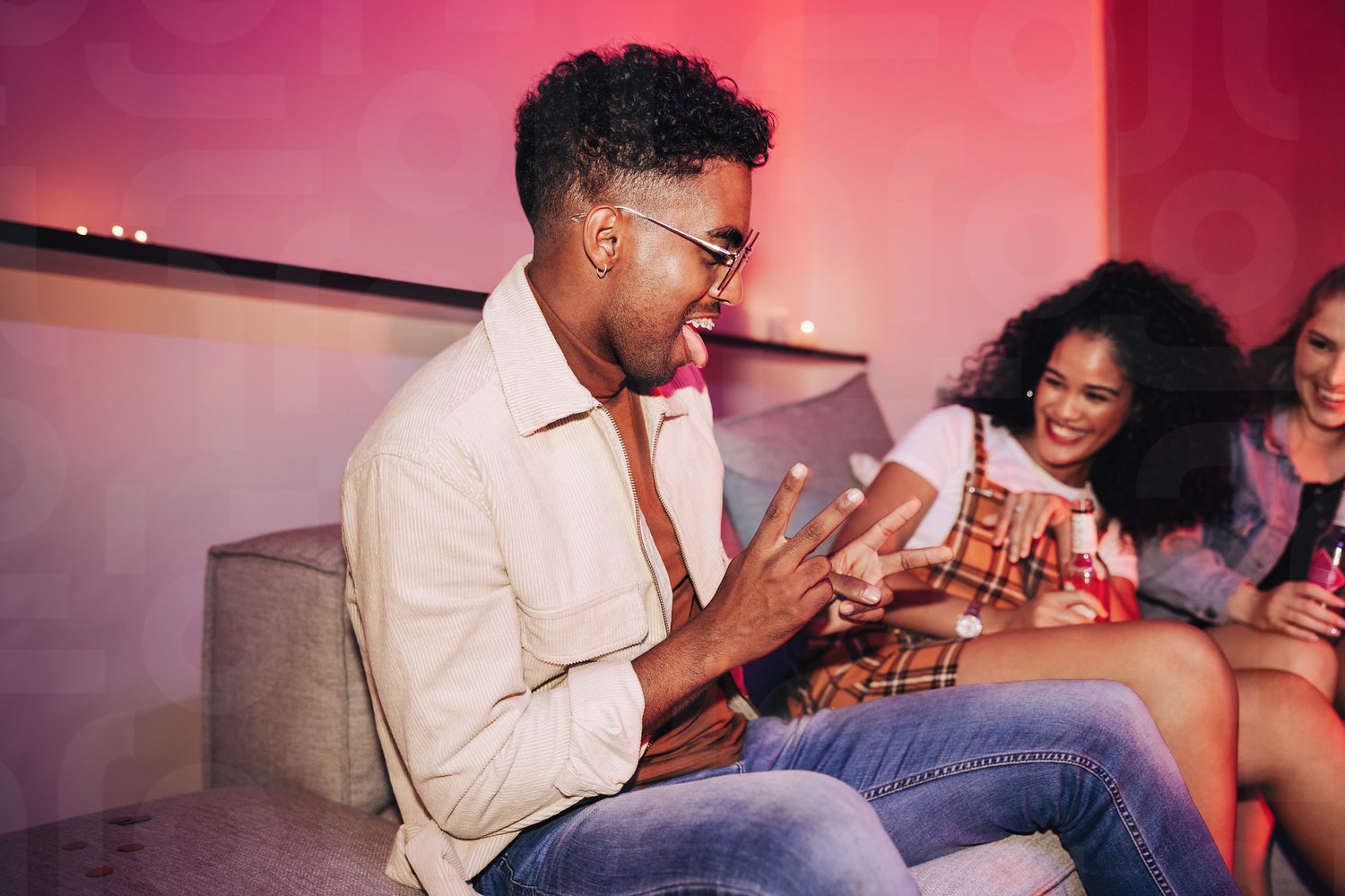 Young man showing off his dance moves at a house party. Vibrant young man dancing happily while sitting on a couch with his friends. Group of friends having a good time together on the weekend.
