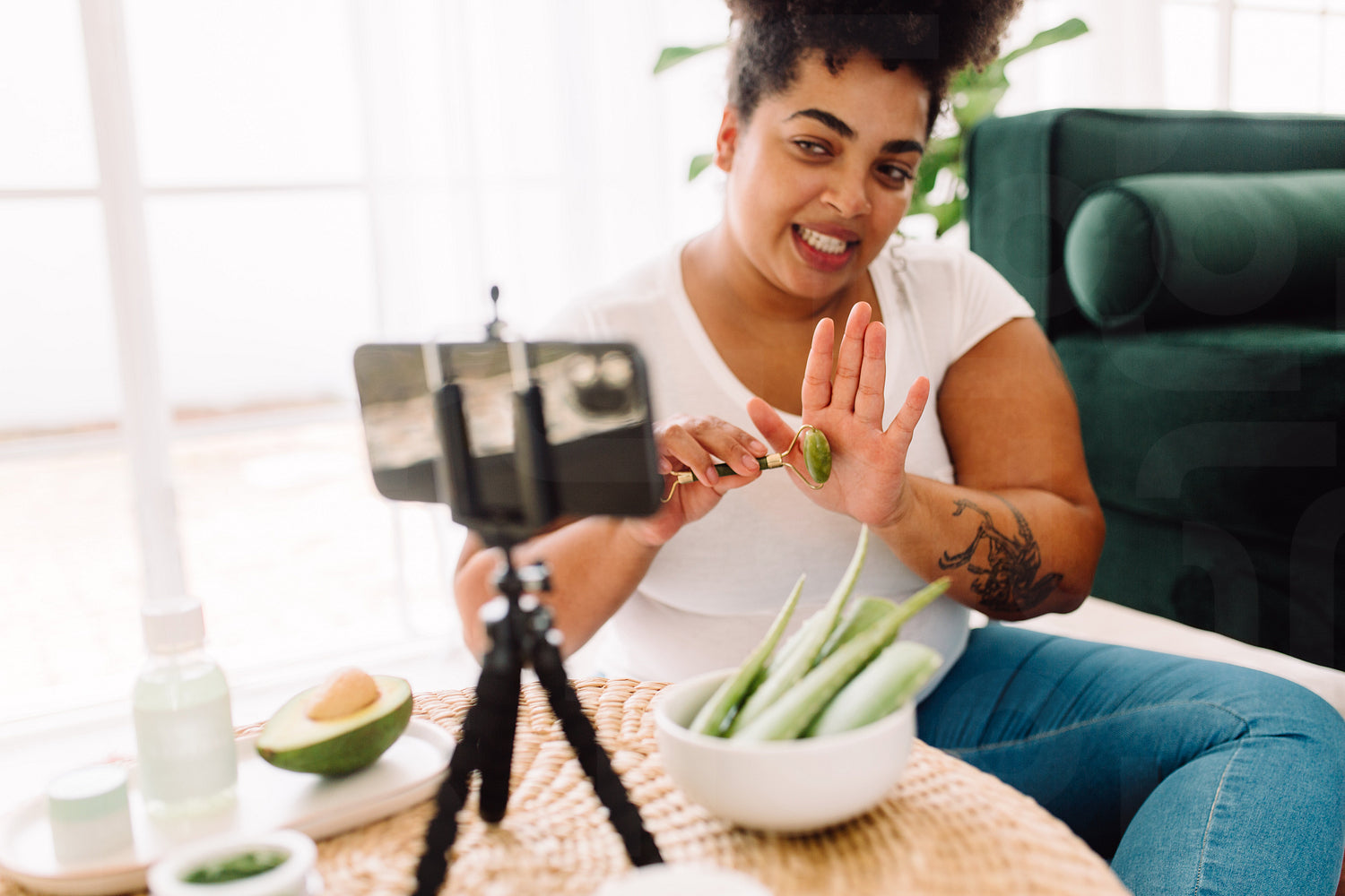 Healthy woman vlogger showing jade roller on vlog