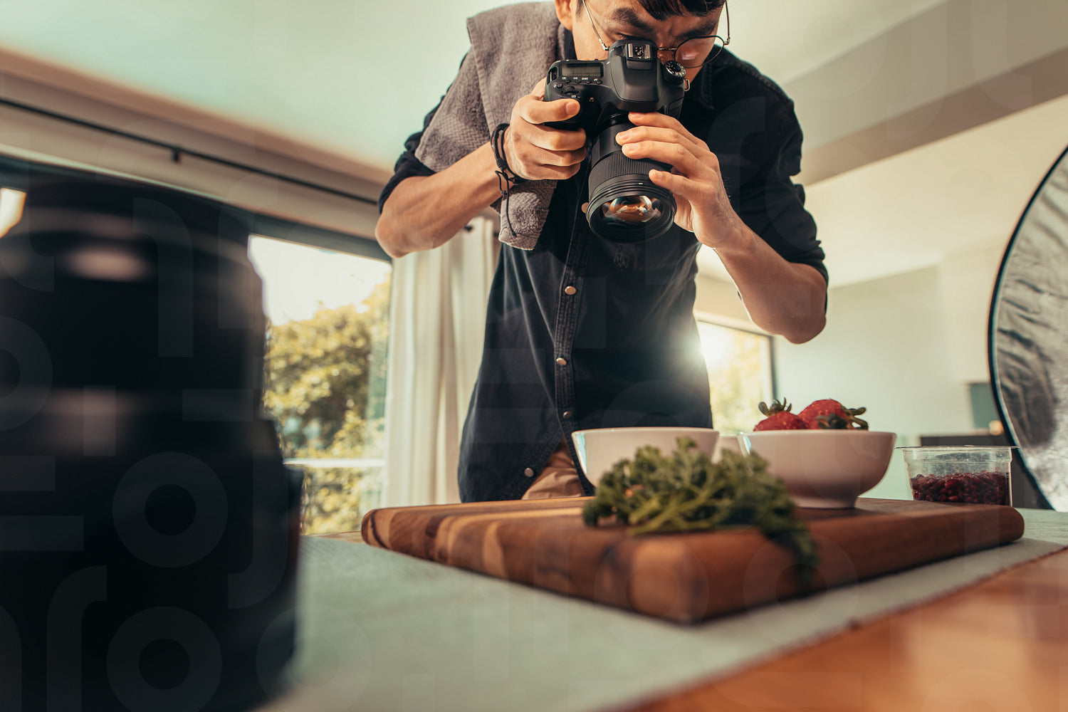 Photographer taking pictures of food in studio. Professional food photographer making food shot for advert.