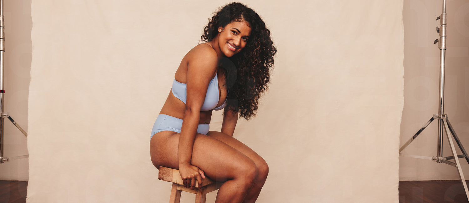 Carefree young woman feeling comfortable in her own body. Happy young woman smiling at the camera while sitting in blue underwear. Confident young woman embracing her natural body in a studio.